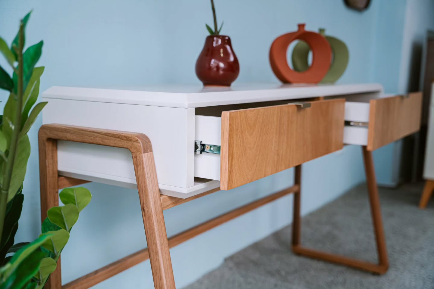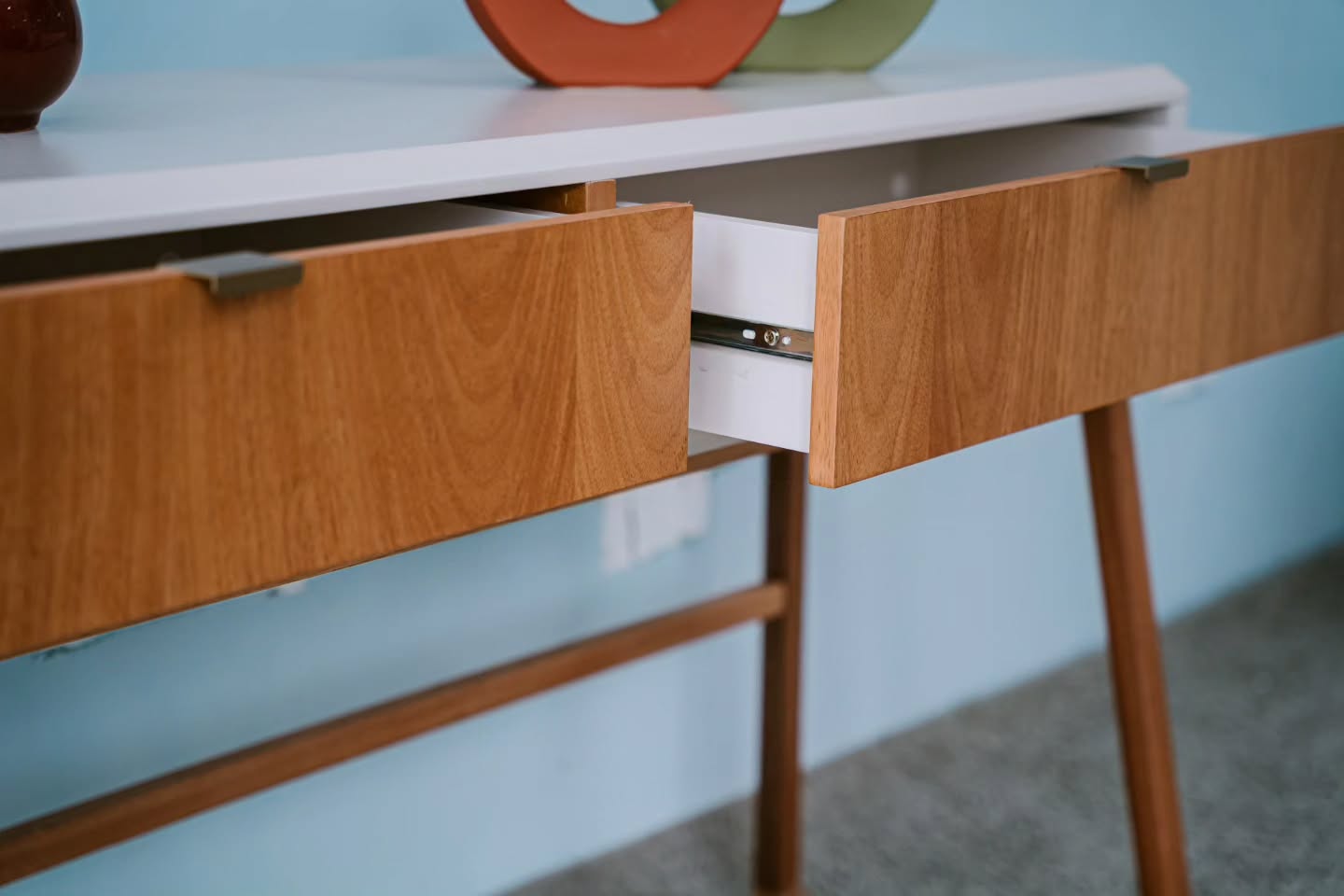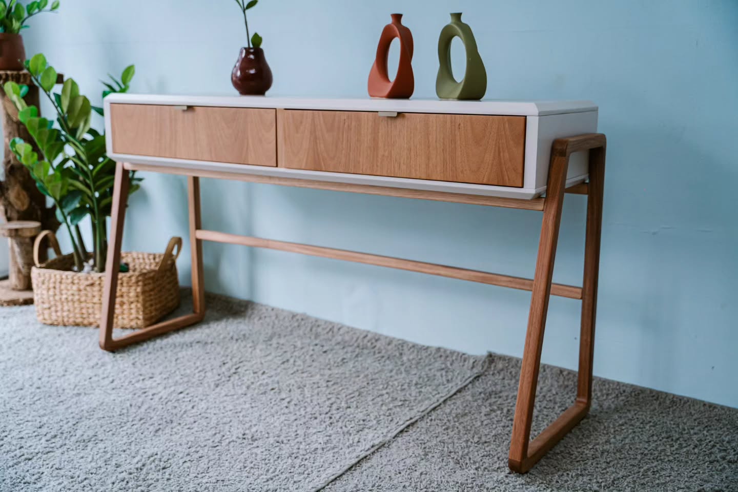 Fabricado em madeira, o aparador conta com duas gavetas espaçosas, ideais para organizar itens essenciais no dia a dia. Suas dimensões permitem fácil adaptação a diversos ambientes, como sala de estar, corredor ou quarto, agregando charme e praticidade ao lar.