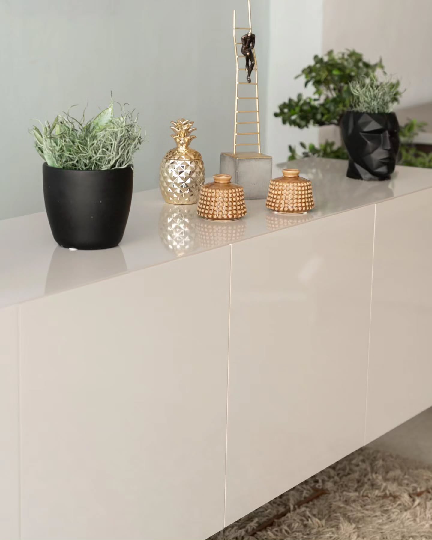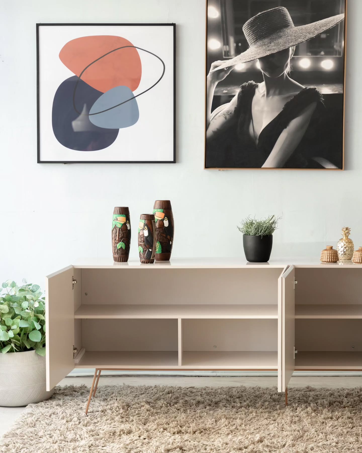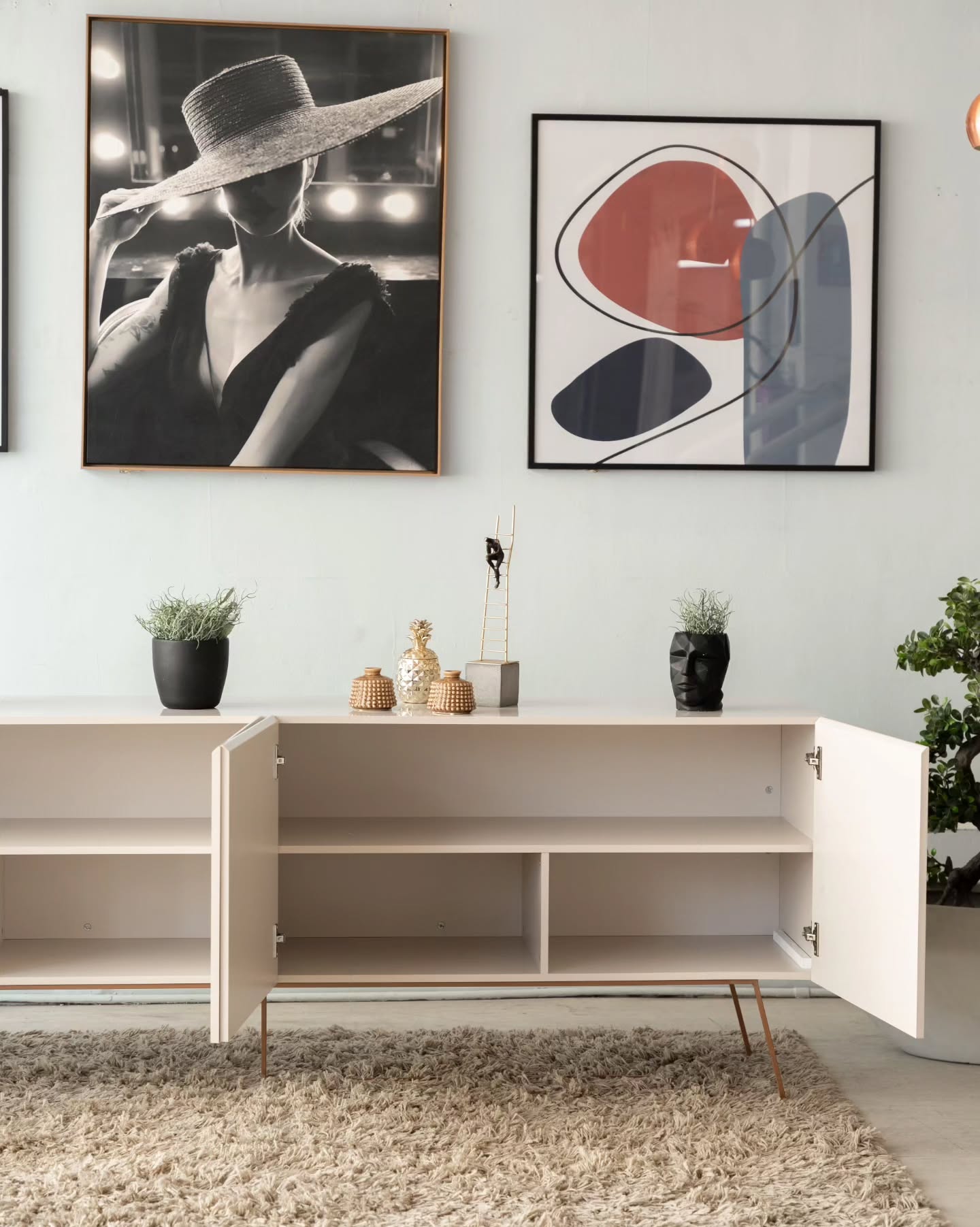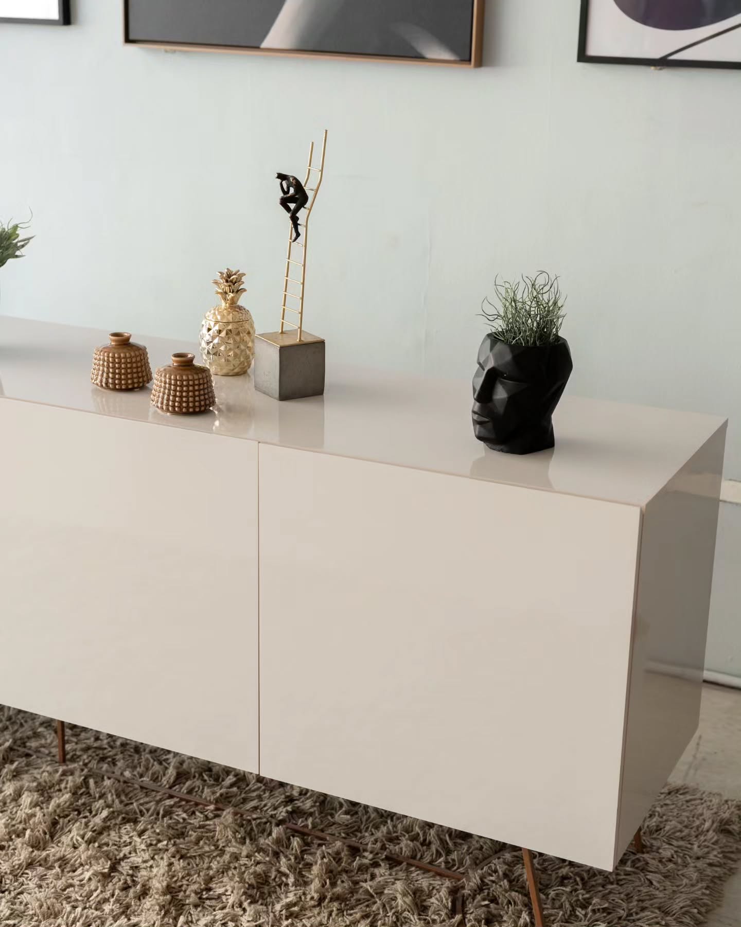 Disponível em MDF ou laminado Cinamomo, o buffet conta com prateleiras internas e caixaria com pintura UV, garantindo durabilidade e acabamento de qualidade. Seus pés em metal reforçam o visual moderno e trazem leveza à composição.