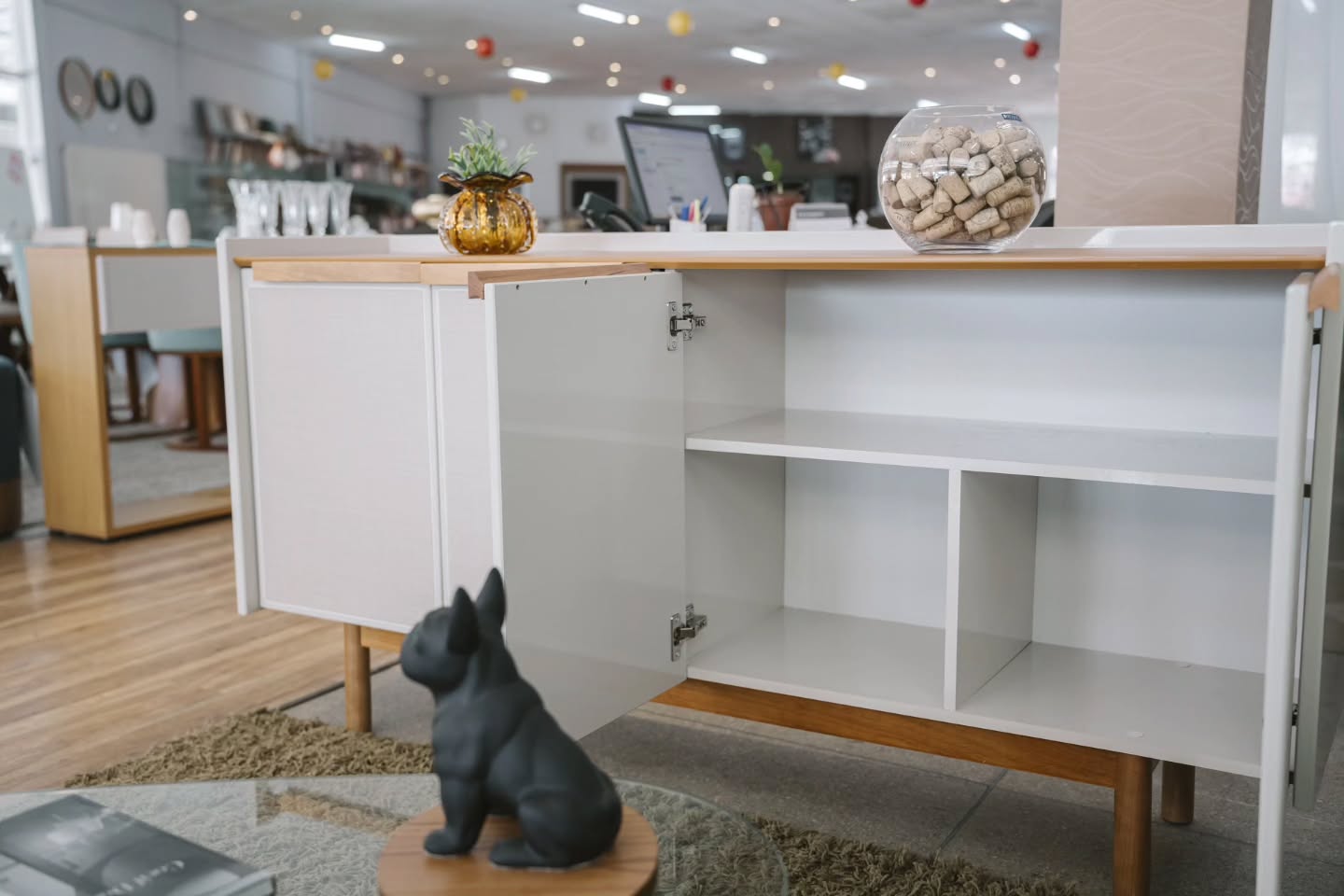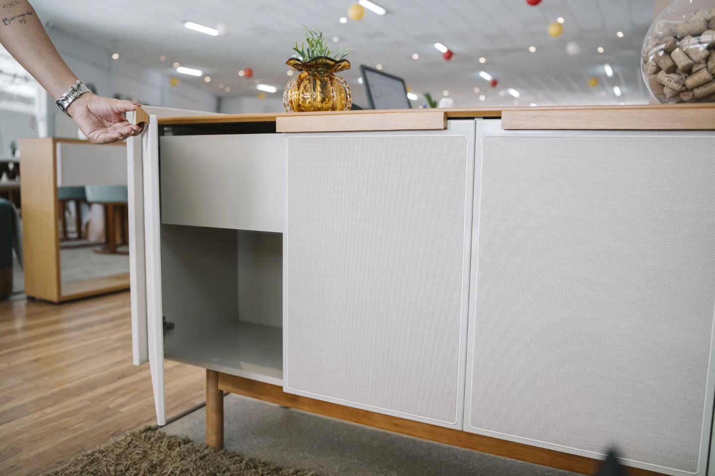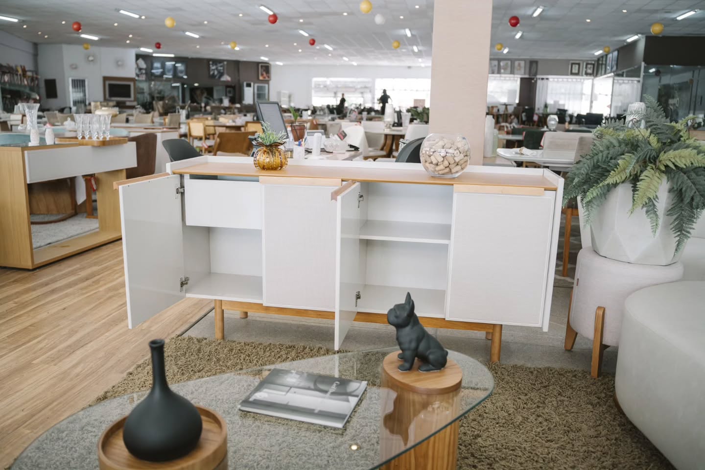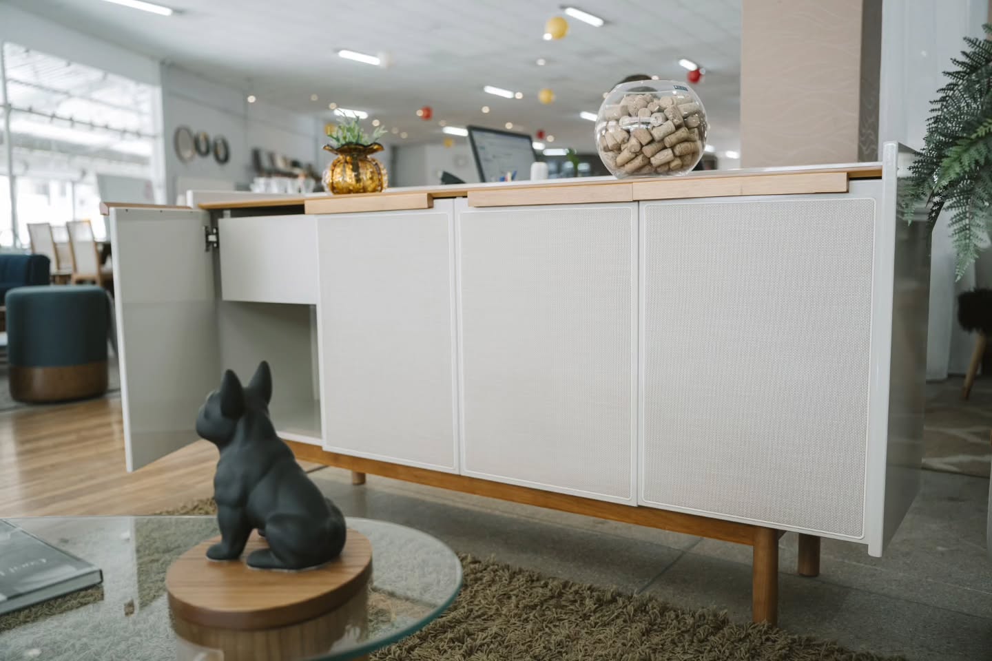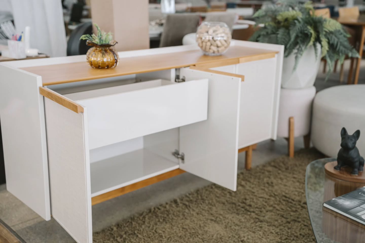 O tampo “bandeja” em MDF chanfrado com borda laqueada eleva a estética, enquanto as dobradiças com amortecedor e a gaveta interna com corrediça telescópica proporcionam um uso silencioso e prático. Uma prateleira interna completa sua funcionalidade com um toque de refinamento.