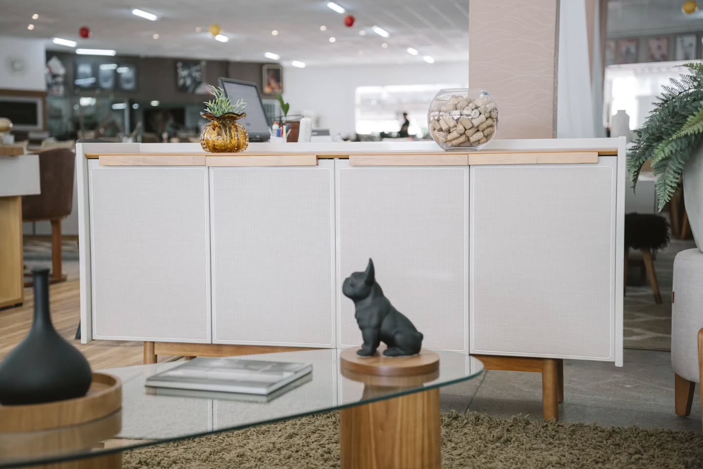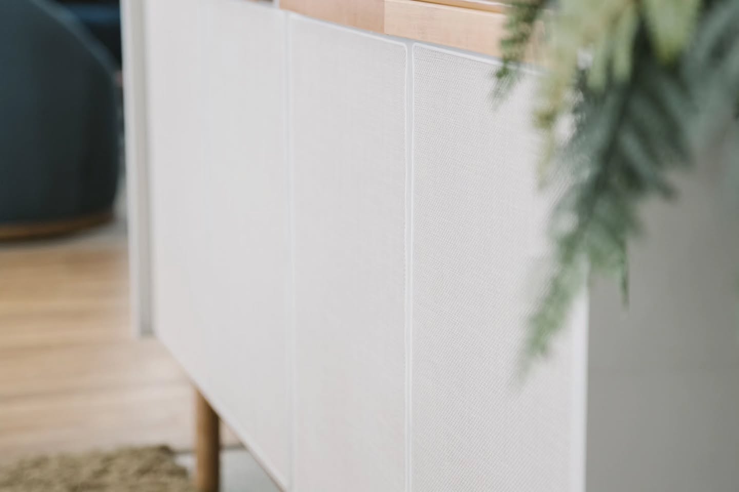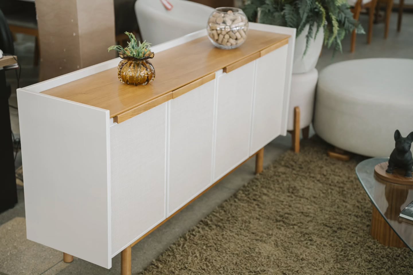 Suas portas em MDF de 15mm possuem bordas laqueadas e revestimento em tela sintética, criando um visual único e contemporâneo. A estrutura é sustentada por base e pés em madeira maciça, garantindo durabilidade e leveza no design.