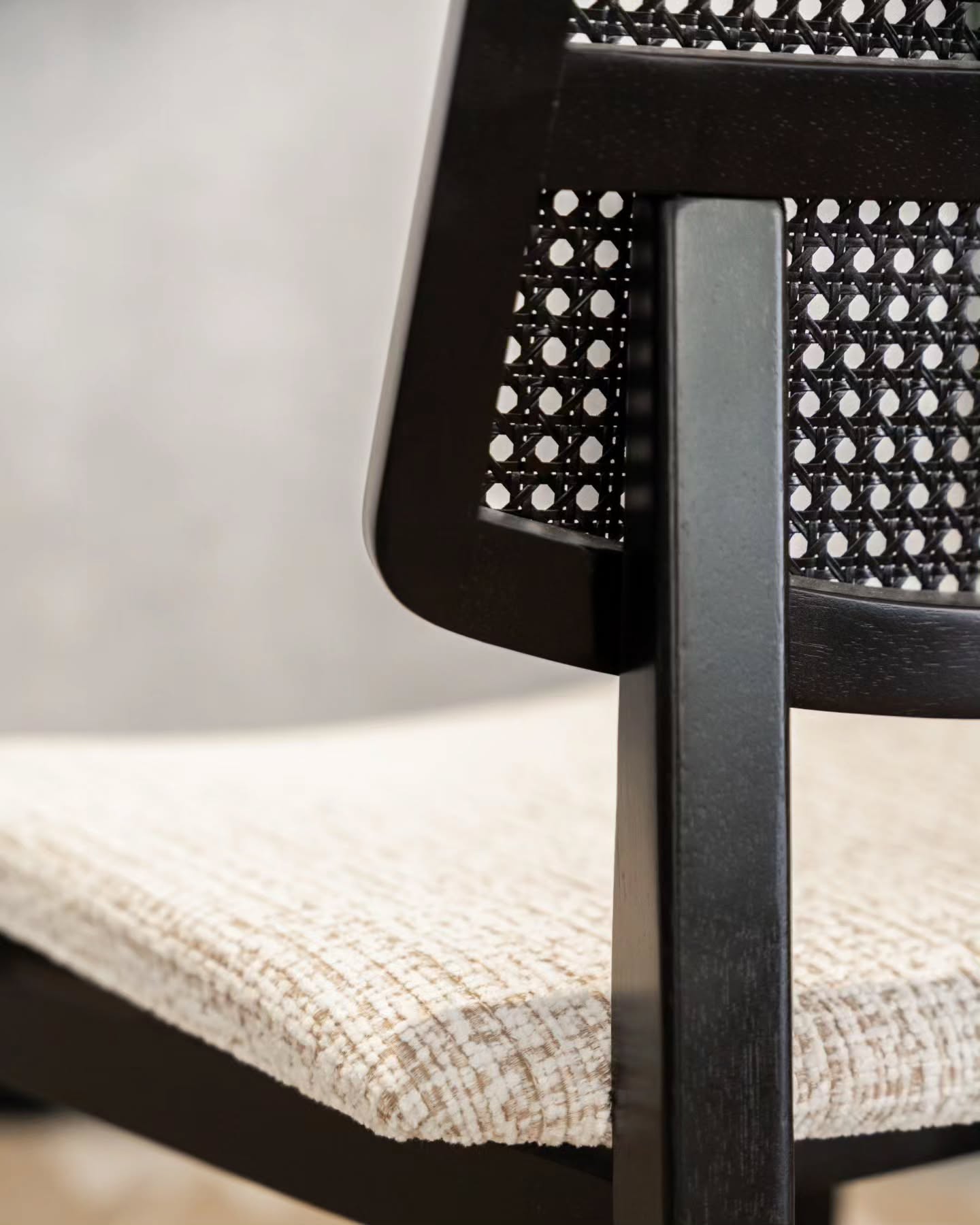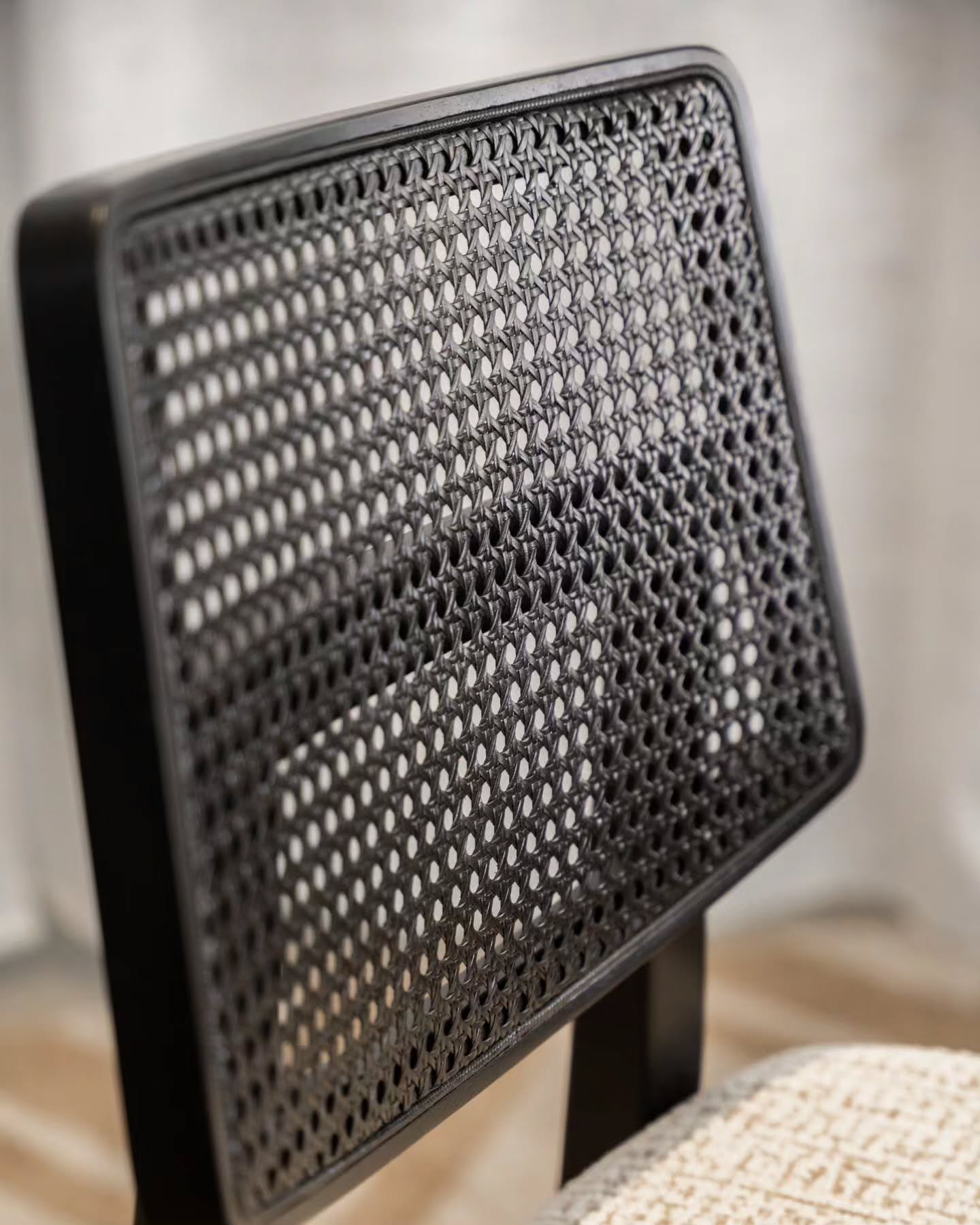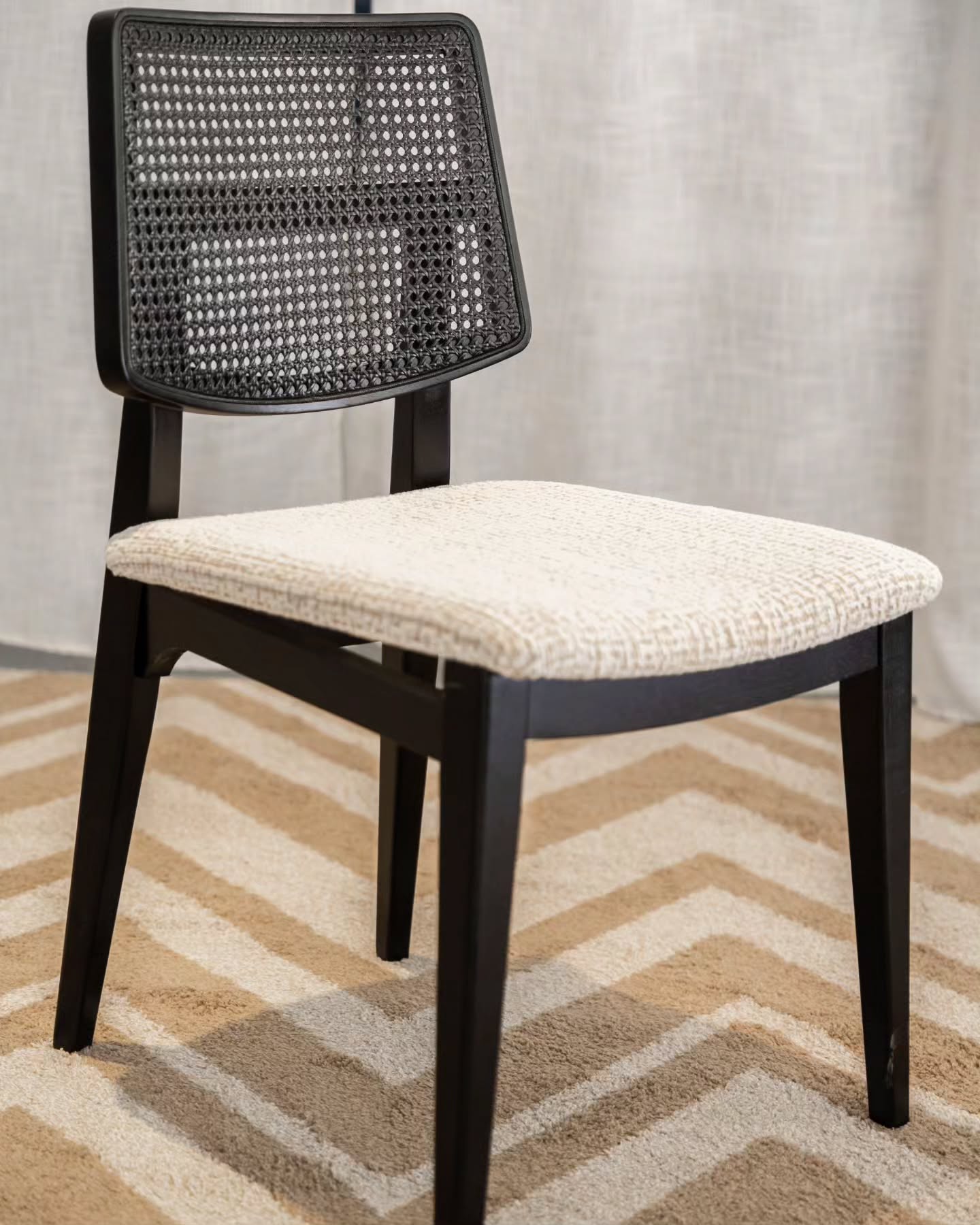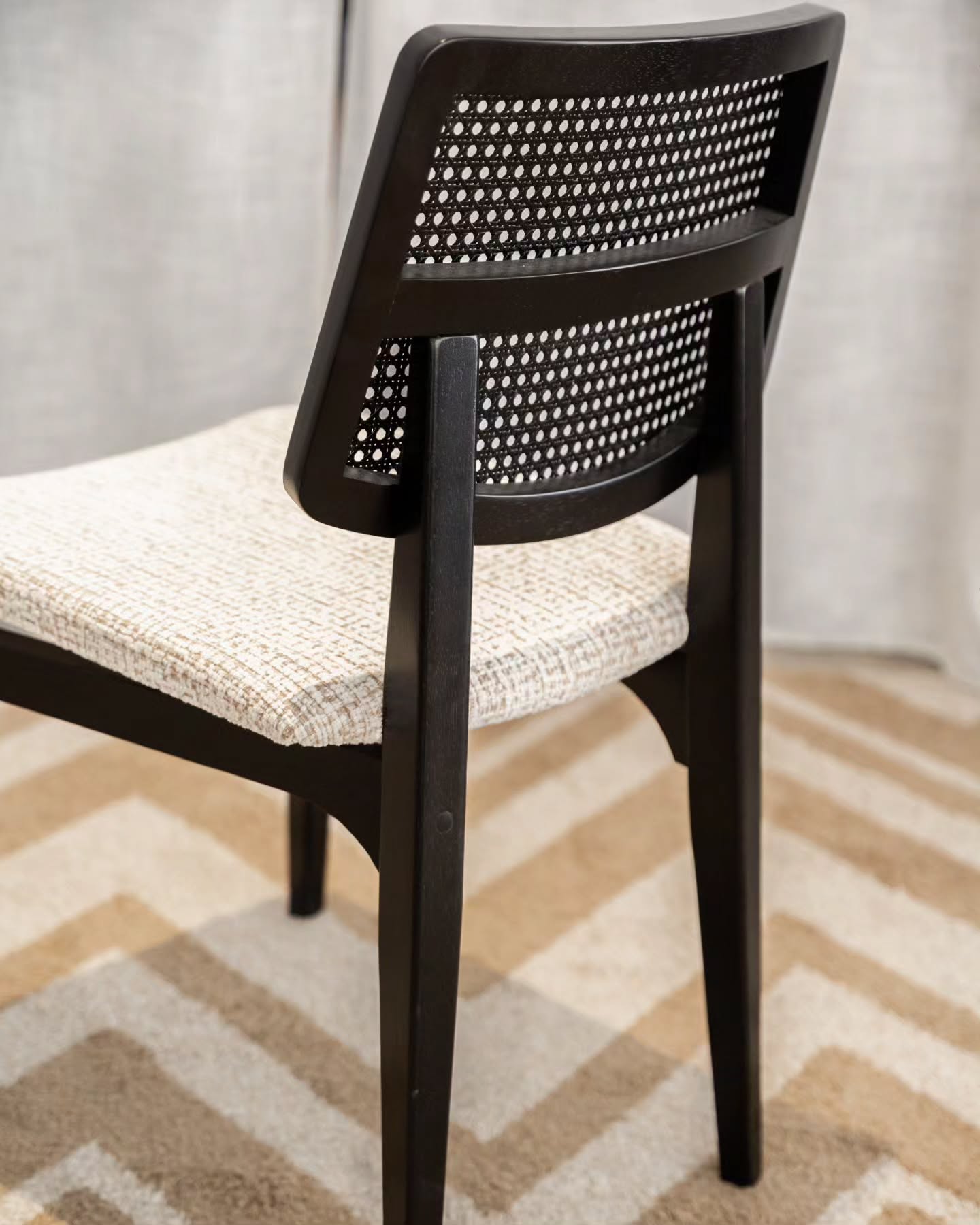 Com acabamento em laca ébano e detalhes em tela portuguesa, a cadeira se destaca pelo cuidado nos acabamentos. O assento estofado, revestido em linho, oferece conforto superior e pode ser personalizado, permitindo combinar perfeitamente com o estilo e a decoração do ambiente.