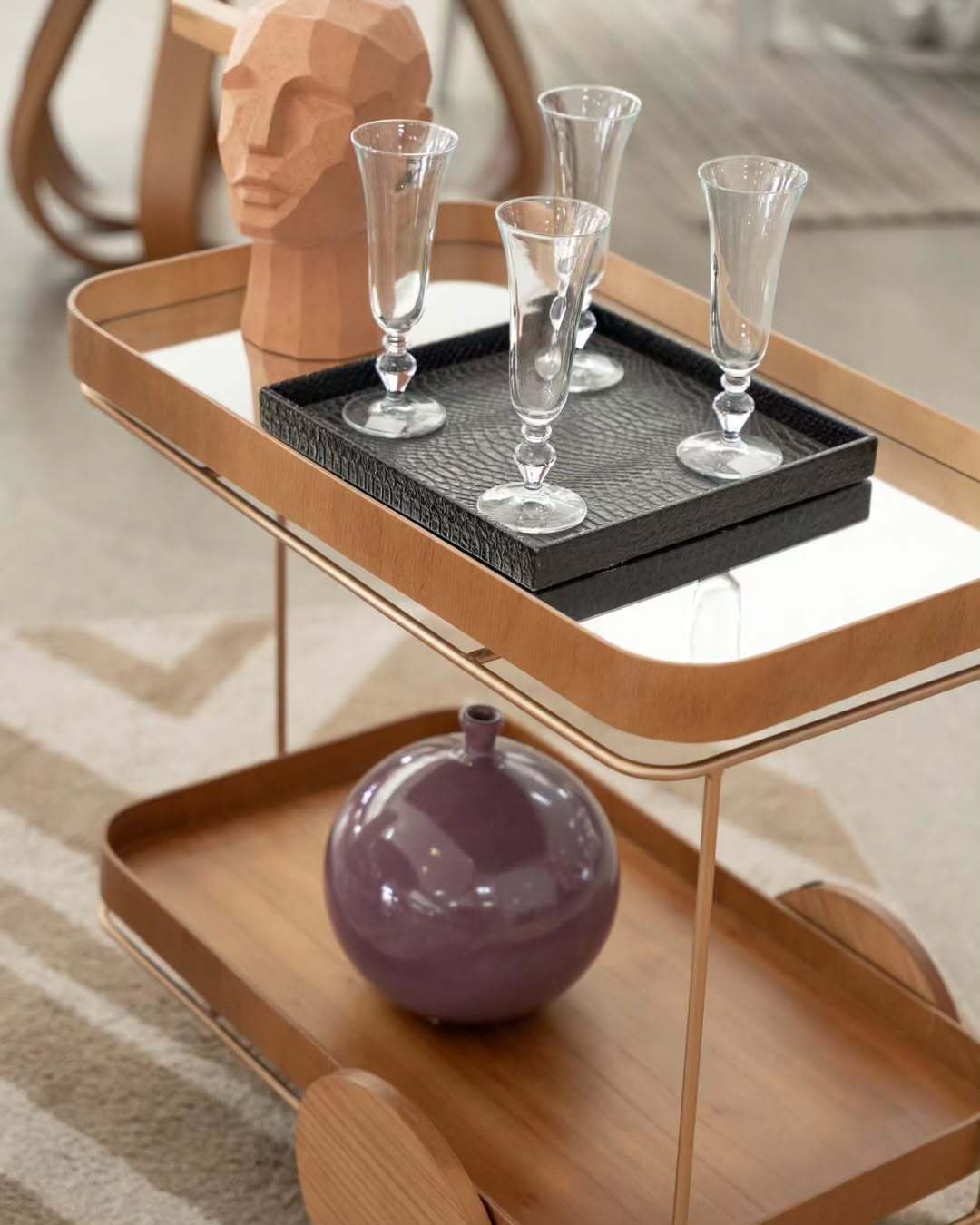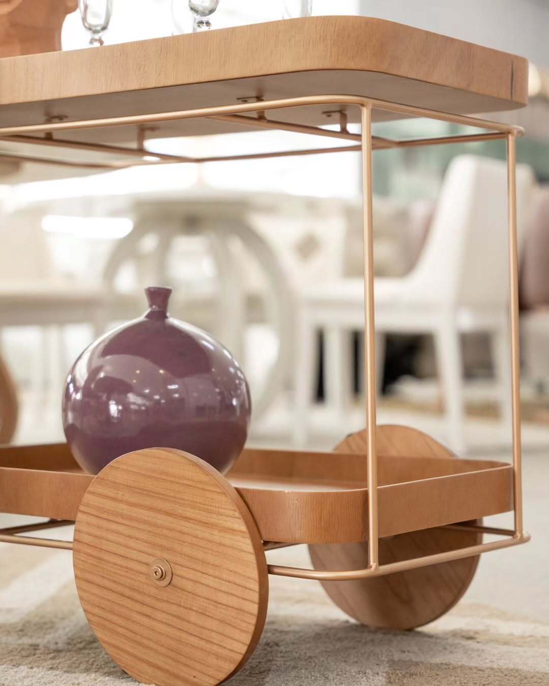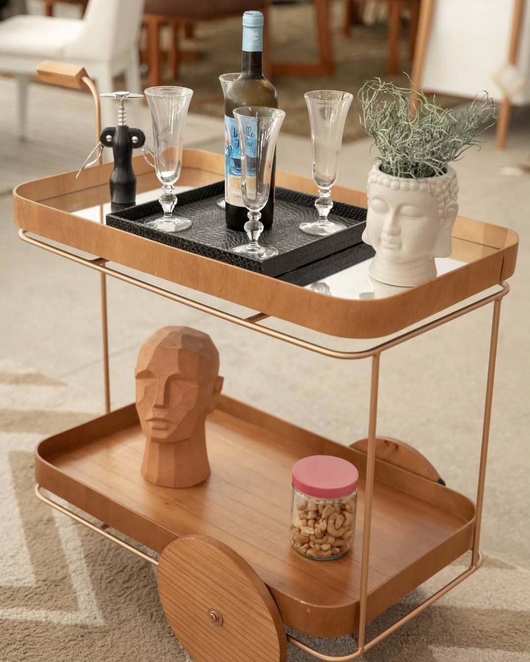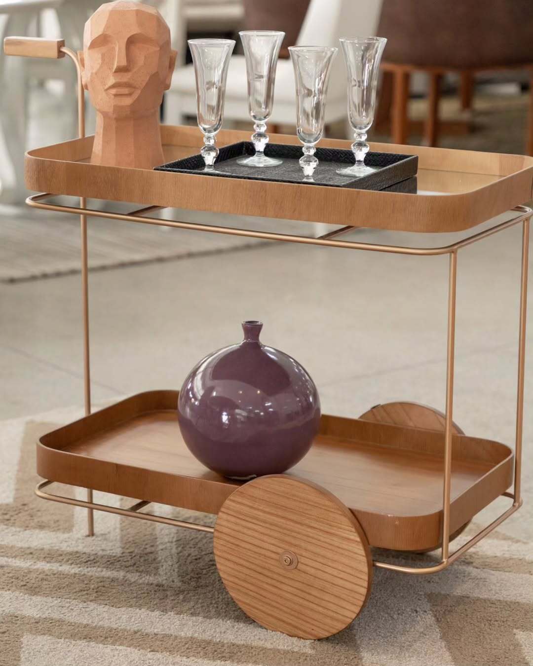 Carrinho Lennon em madeira maciça, com tampo em lâmina ou espelhado, ideal para chá ou bar com estilo e praticidade.