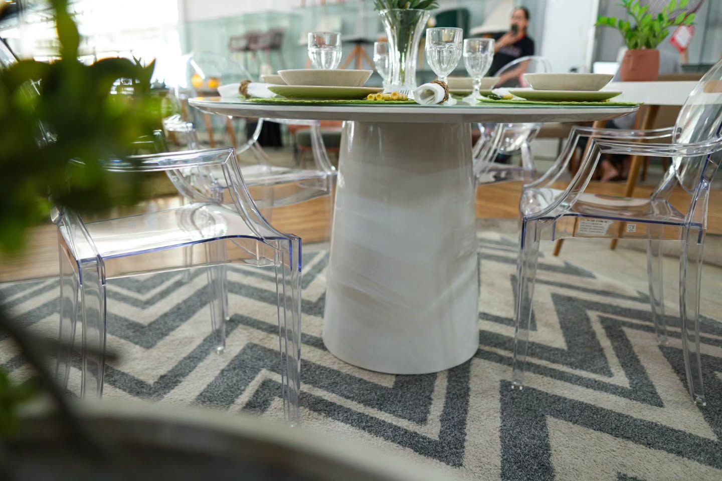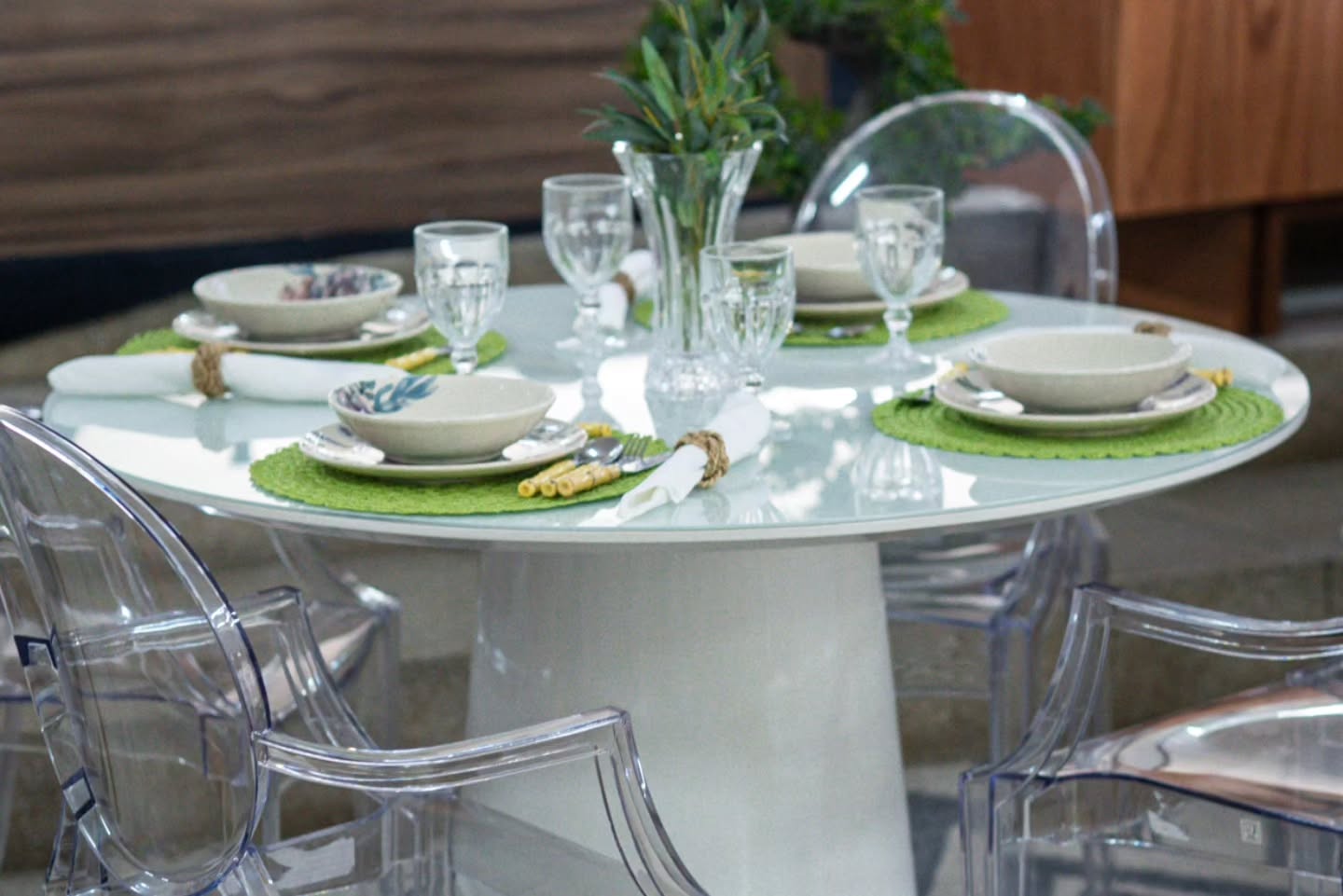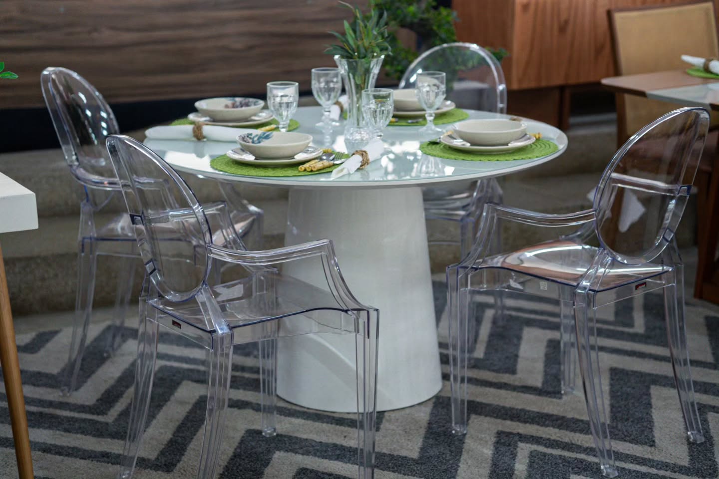 Acompanha poltronas em policarbonato, que agregam leveza e sofisticação ao ambiente.