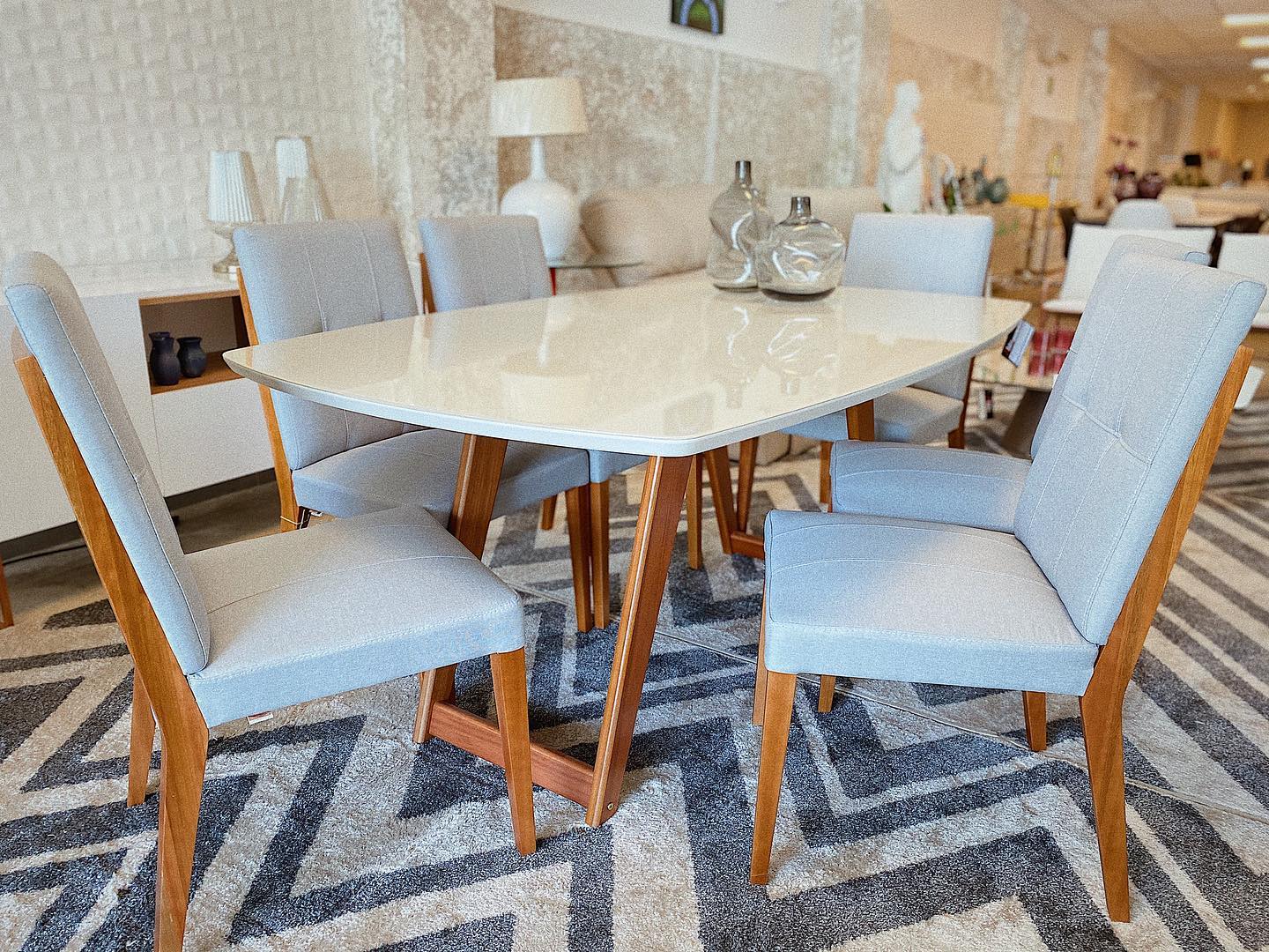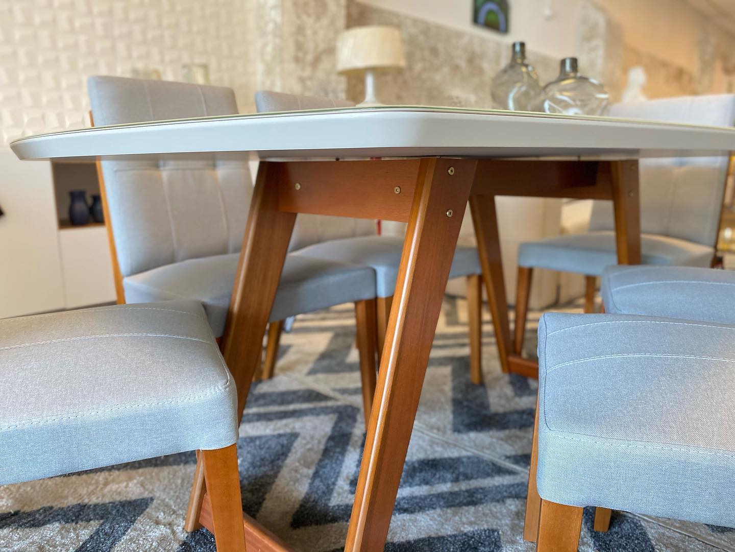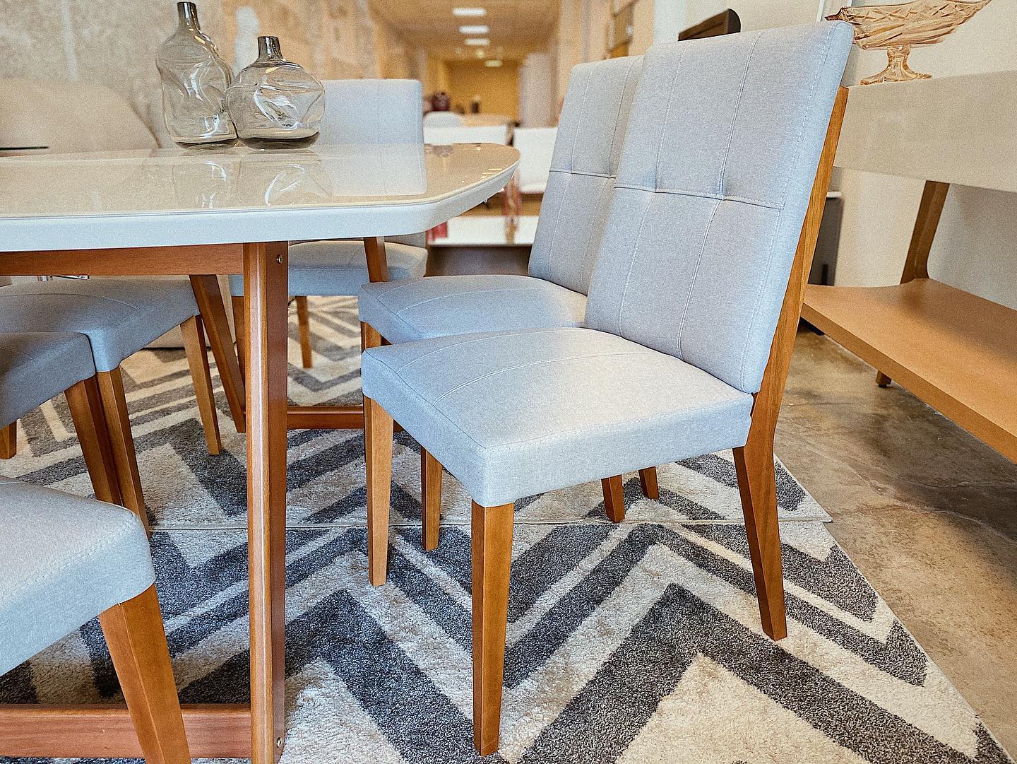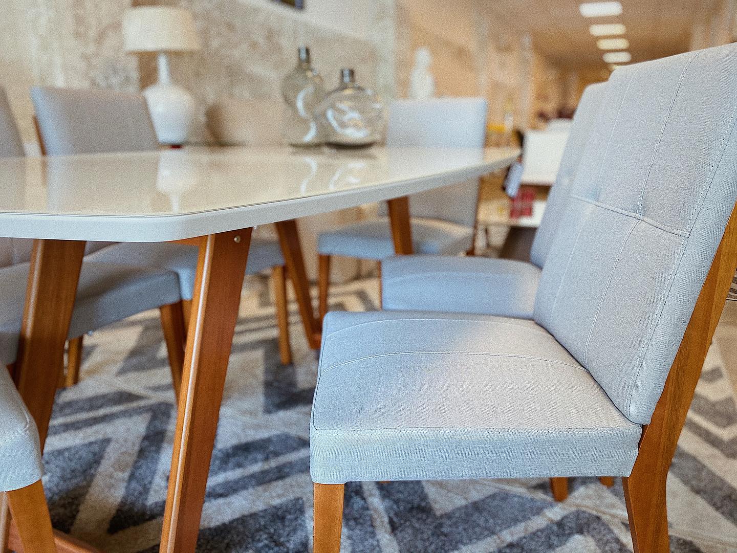 A mesa de jantar possui base em madeira amêndoa e tampo com vidro off-white, trazendo leveza e modernidade ao conjunto. As cadeiras contam com estrutura em madeira amêndoa e revestimento em tecido cinza, garantindo conforto e harmonia visual ao ambiente.