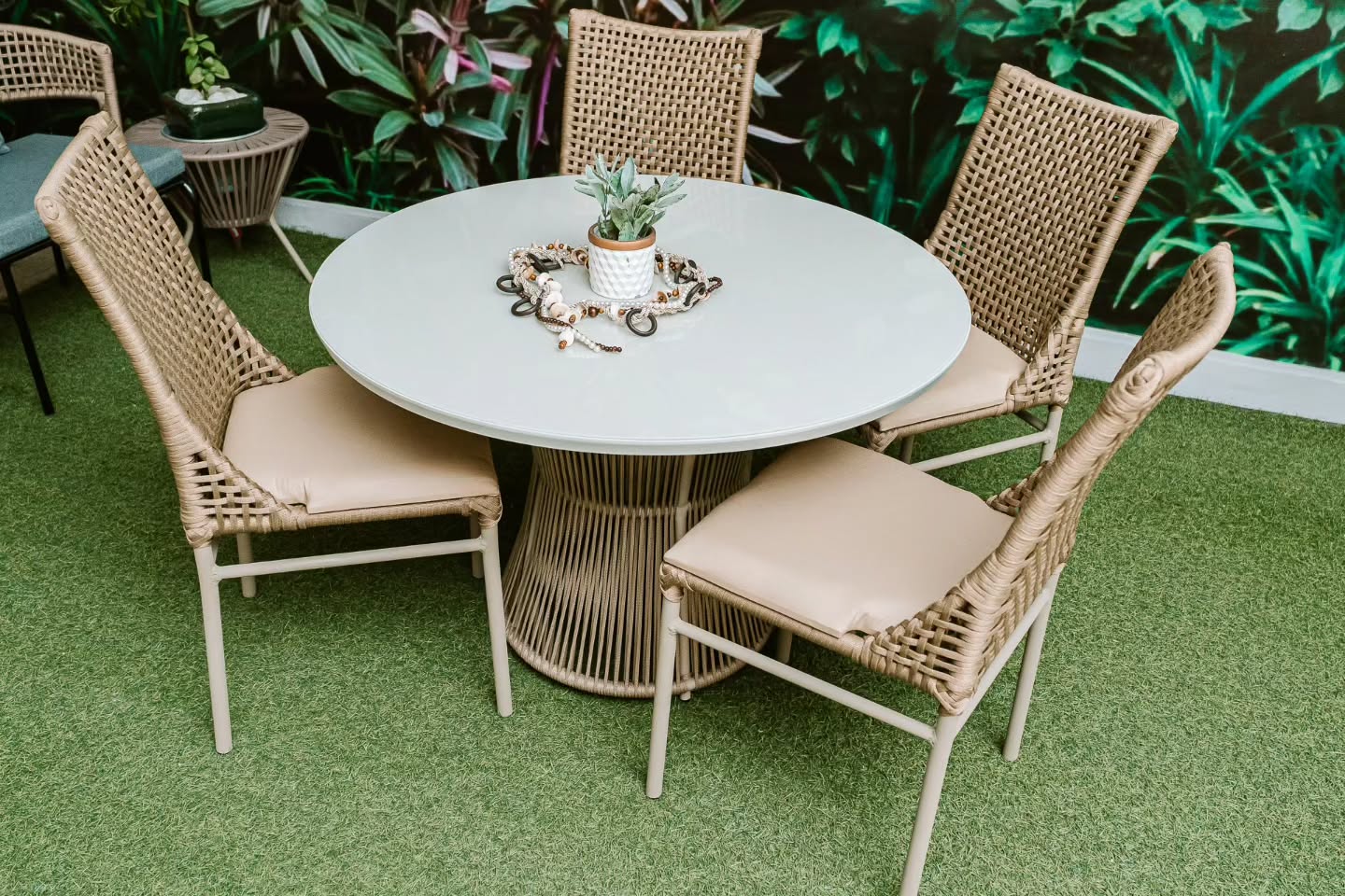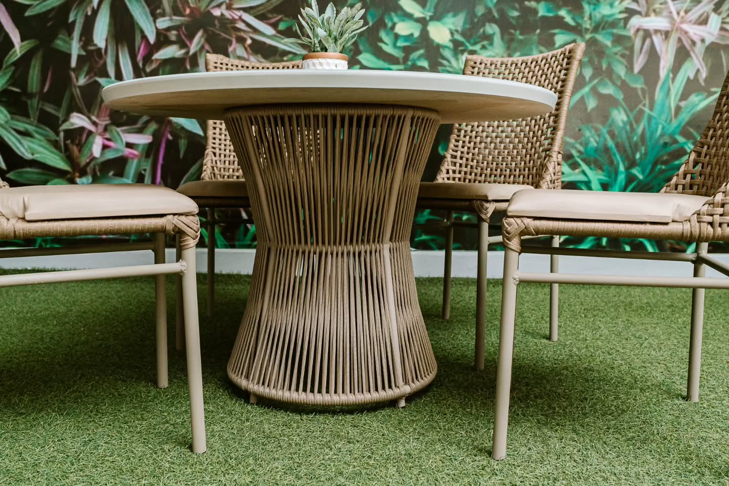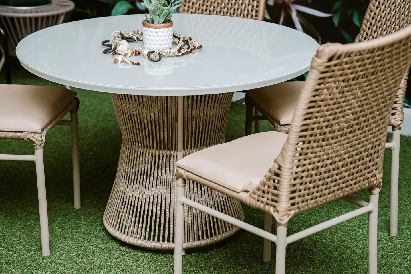 O Conjunto Jericoacoara reúne modernidade, versatilidade e conforto em uma composição elegante e funcional. Com diâmetro de 1,05 m, a mesa acomoda confortavelmente até quatro cadeiras, criando uma experiência acolhedora para diferentes ambientes. Sua estrutura em alumínio com pintura epóxi garante durabilidade e resistência, enquanto o acabamento em corda naval acrescenta um toque exclusivo e sofisticado ao design. Versátil e elegante, é a escolha ideal para transformar qualquer espaço em um ambiente convidativo e especial.