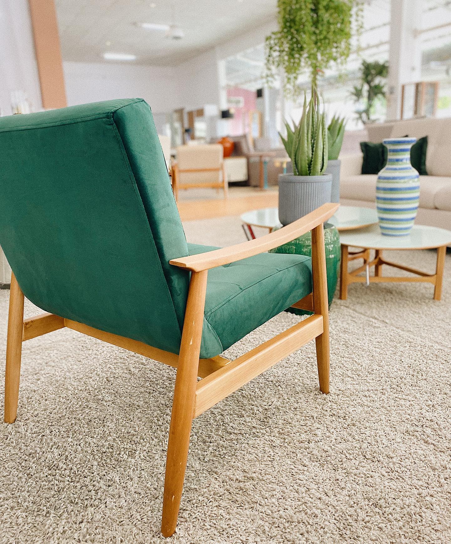 O sofá fixo conta com almofadas soltas e costura diferenciada aparente, além de espuma siliconada que não deforma, garantindo conforto e durabilidade. A poltrona em madeira possui almofada avulsa revestida em suede colorido super macio. O conjunto é complementado por mesas de centro em madeira natural com vidro leitoso branco e uma mesinha lateral que encaixa perfeitamente no braço do sofá, trazendo praticidade ao ambiente.