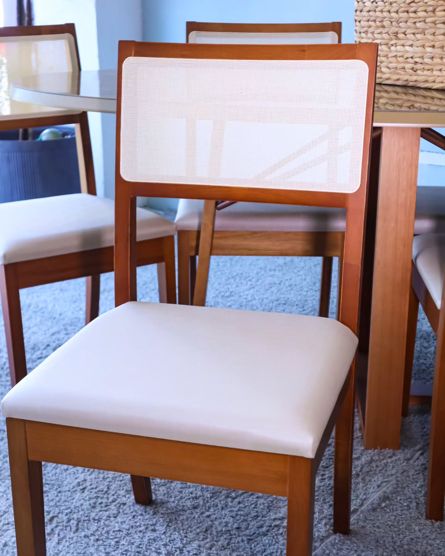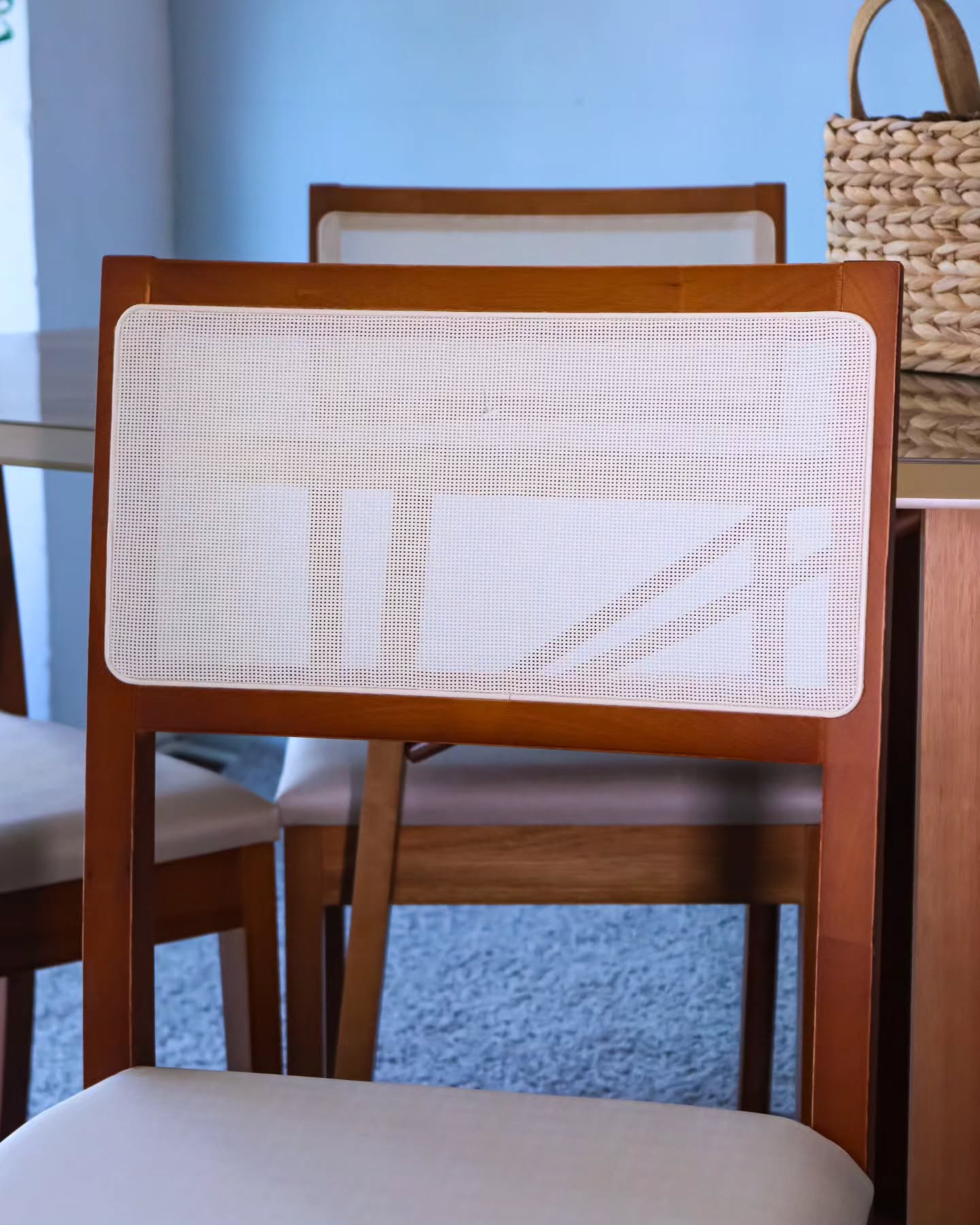 O conjunto é acompanhado por cadeiras em madeira de eucalipto, com encostos em tela natural de algodão, que garantem conforto, leveza visual e um toque de naturalidade ao espaço.