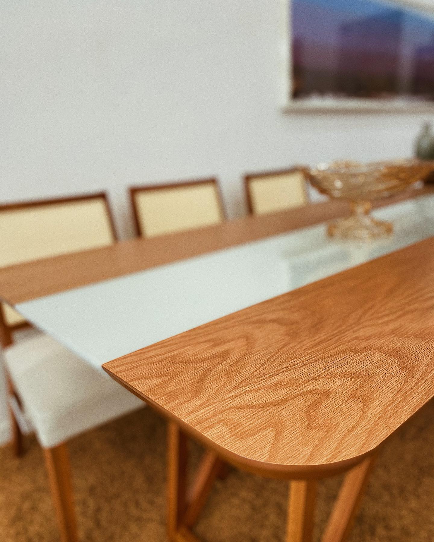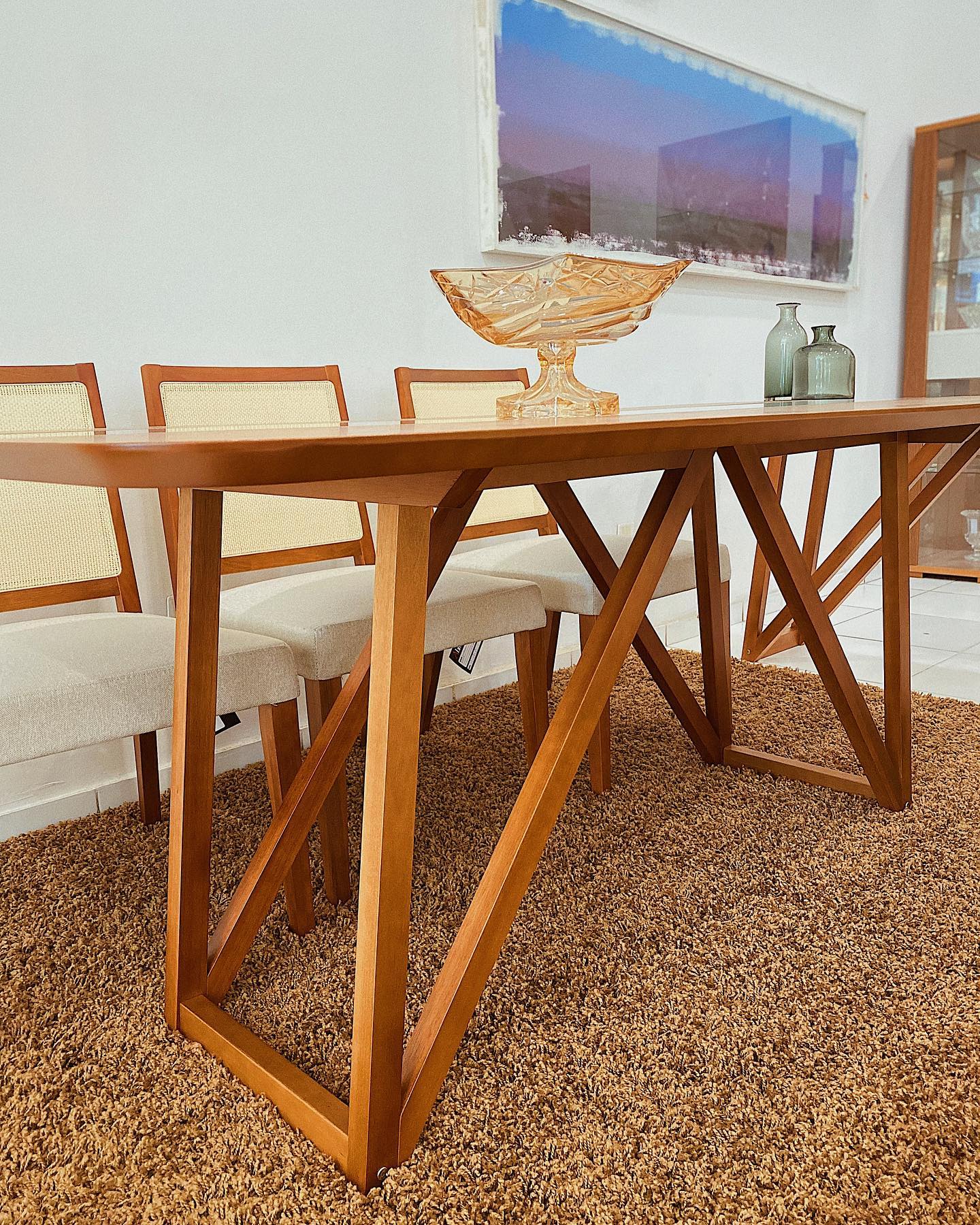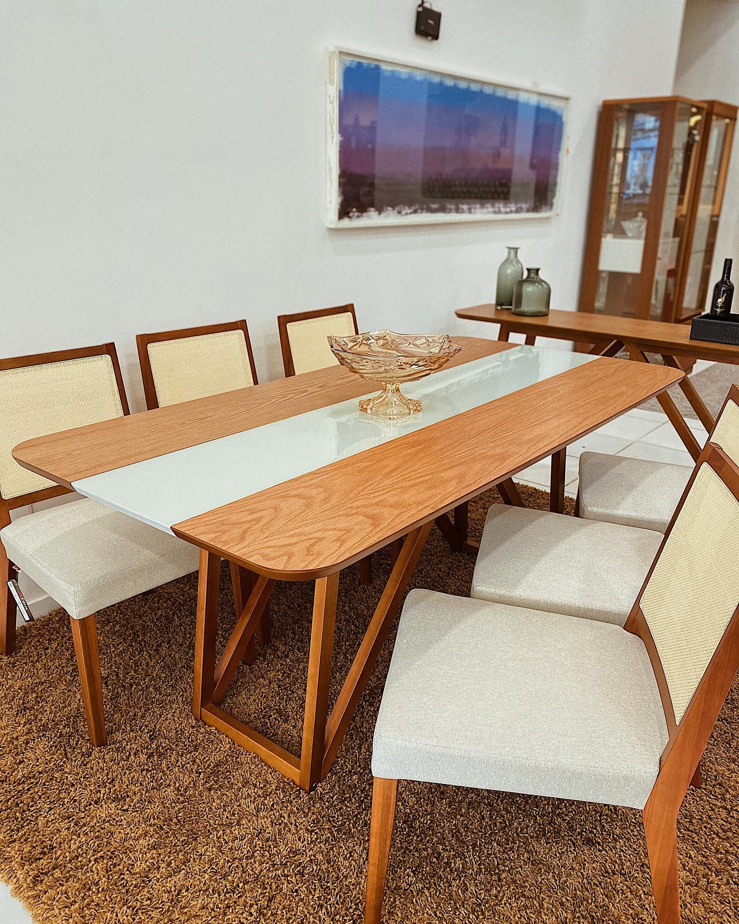 Mesa de jantar em madeira tauari com vidro off-white. Equilíbrio perfeito entre design moderno e rústico para sua sala de jantar.