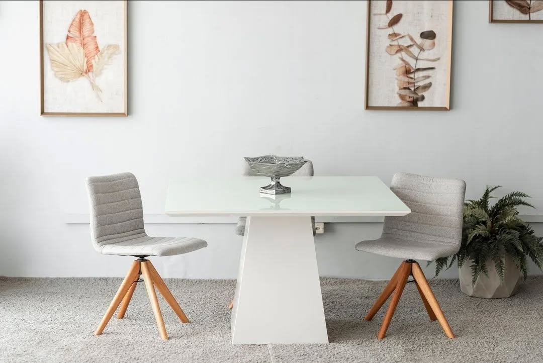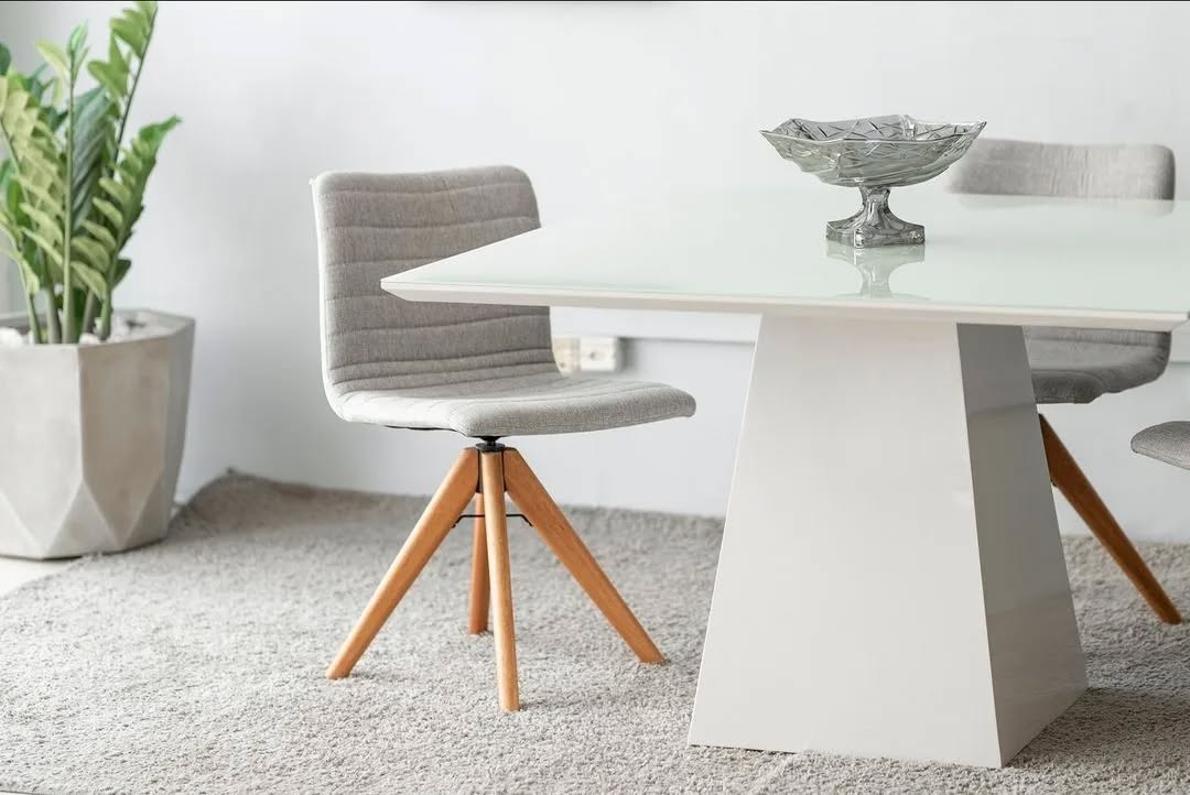 A Mesa Quadrada com Base Piramidal combina design contemporâneo e sofisticação em uma composição elegante e funcional. Com três camadas de laca, a mesa apresenta acabamento refinado e visual marcante. O conjunto é complementado por cadeiras giratórias com base em madeira maciça, oferecendo conforto e praticidade no uso diário. Disponível em diversos tipos de cores e acabamentos, é ideal para quem busca personalização, estilo e qualidade em um único ambiente.