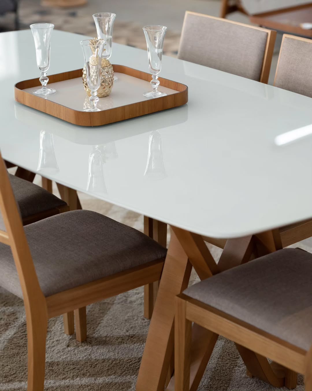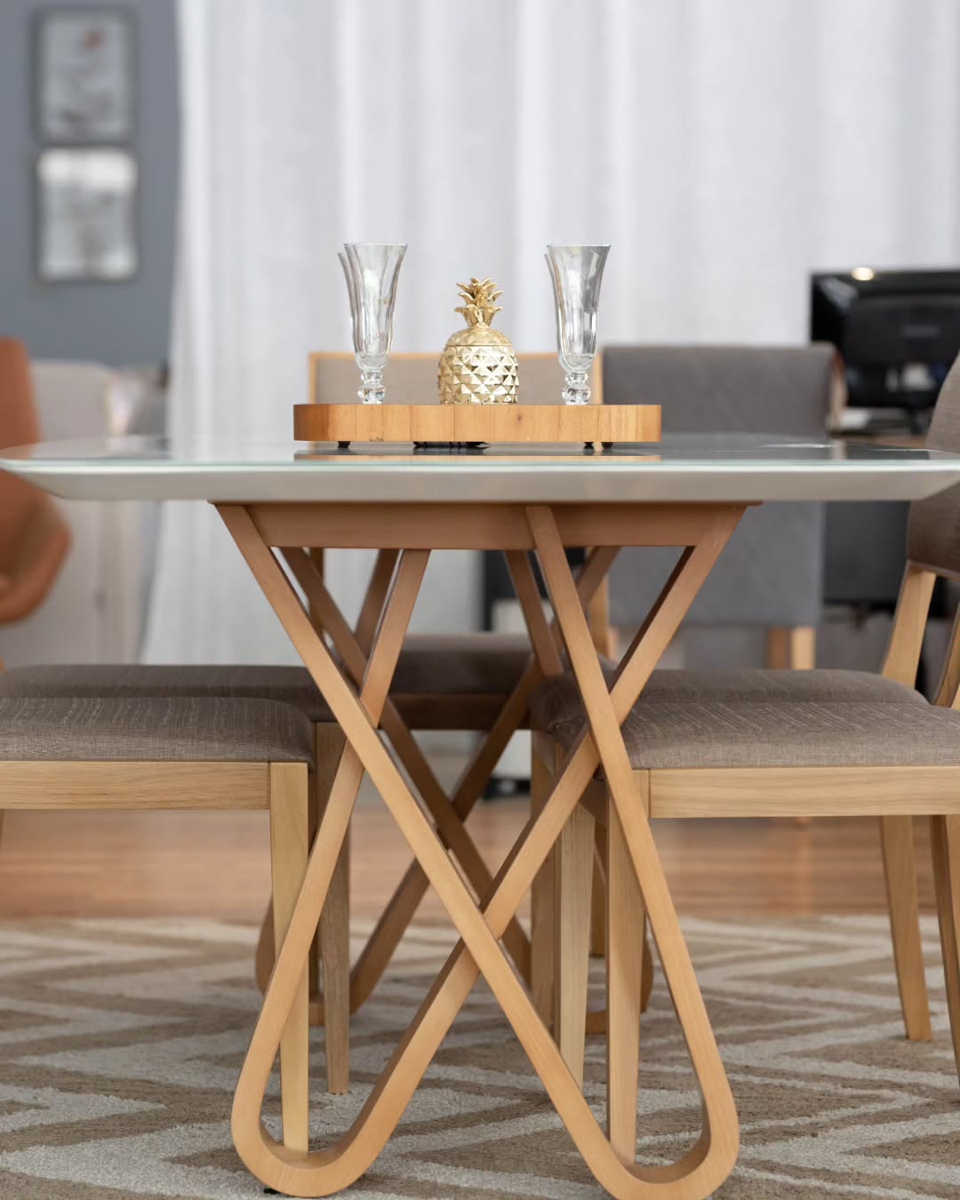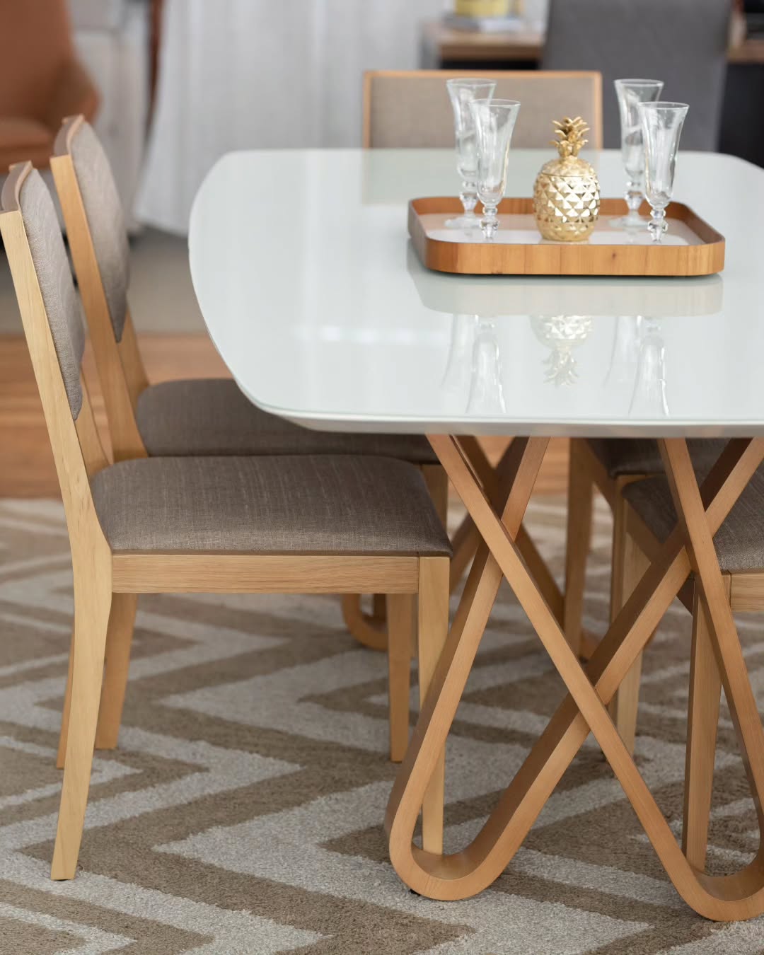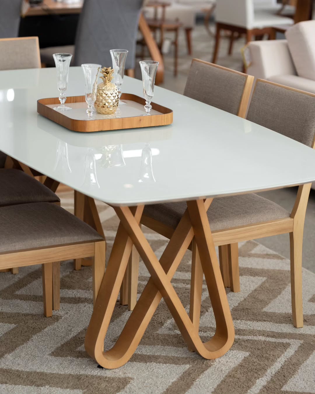 Mesa Sophie em madeira maciça com tampo ovalado em laca e vidro temperado, ideal para quem busca elegância, personalização e harmonia na sala de jantar.