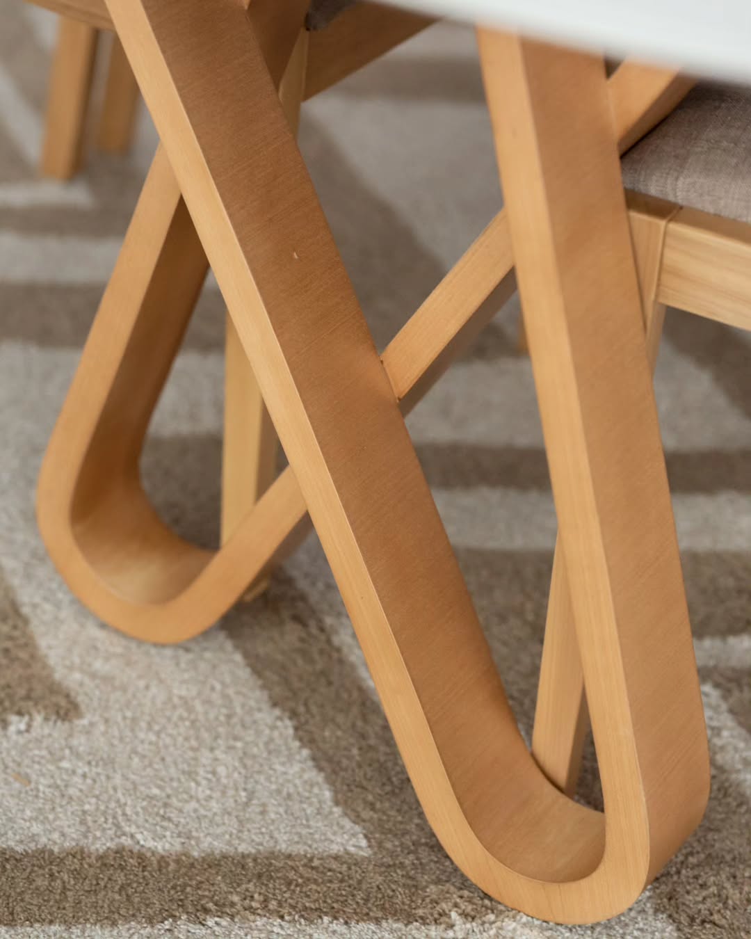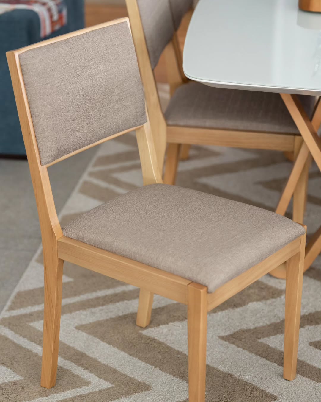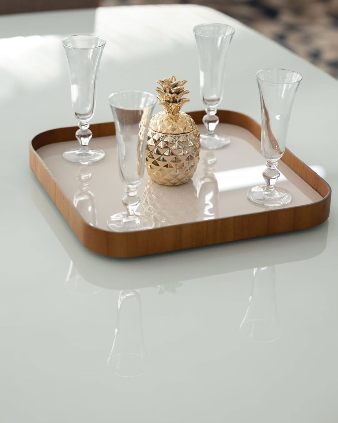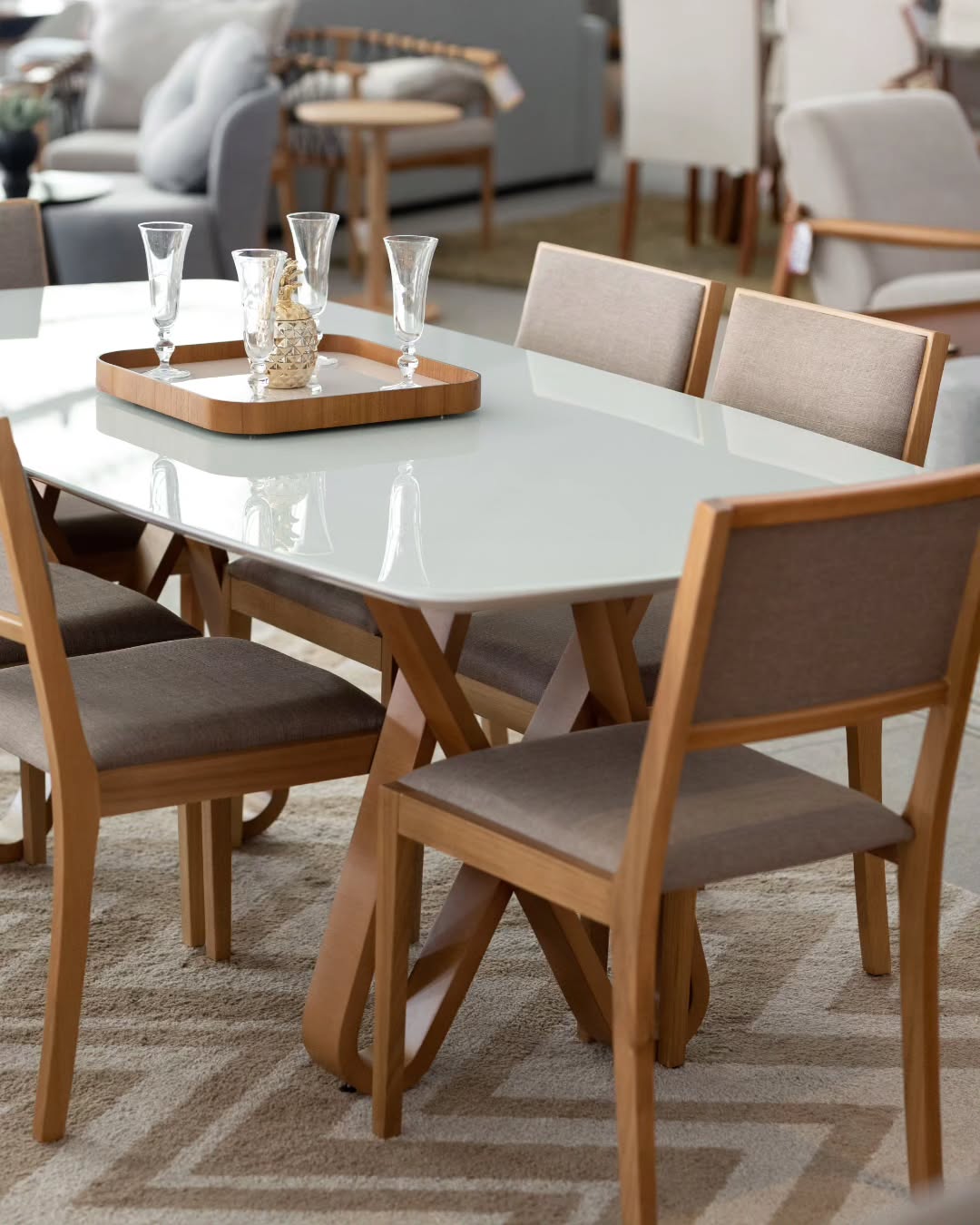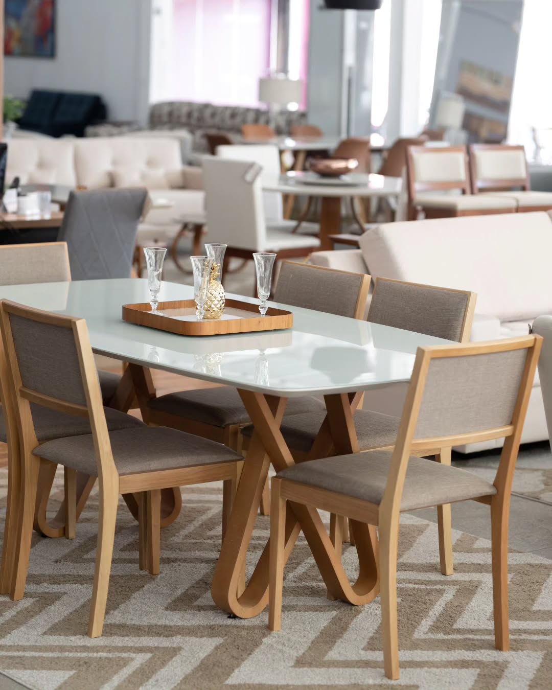 Mesa Sophie em madeira maciça com tampo ovalado em laca e vidro temperado, ideal para quem busca elegância, personalização e harmonia na sala de jantar.