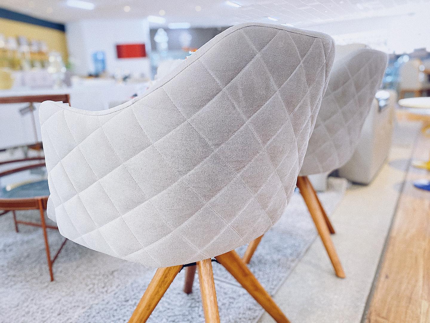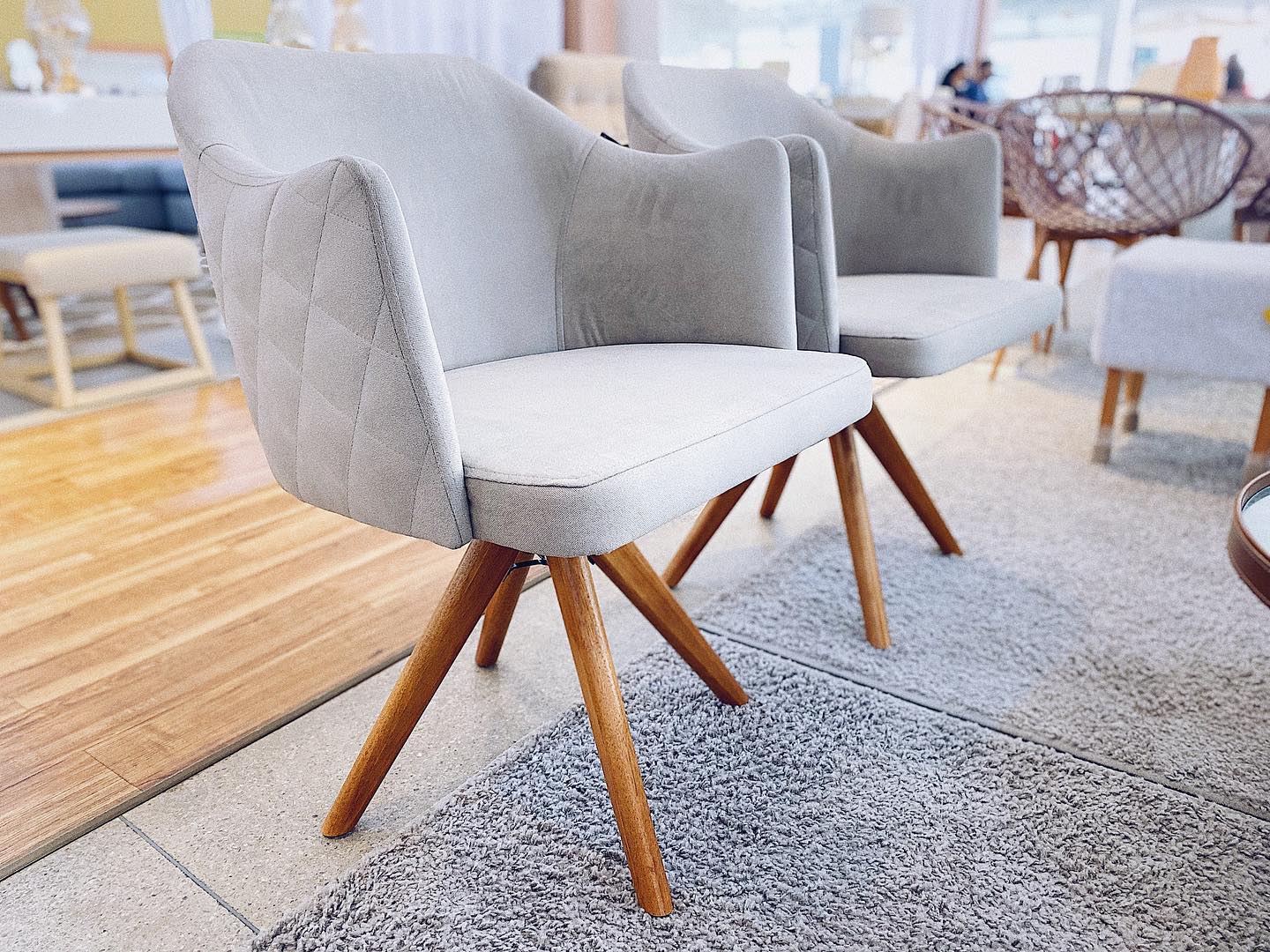 Totalmente produzida em madeira maciça, sua estrutura garante resistência e durabilidade, enquanto o revestimento em tecido suede proporciona um toque macio e acolhedor. O sistema giratório oferece praticidade e liberdade de movimento, tornando a experiência ainda mais confortável no dia a dia.