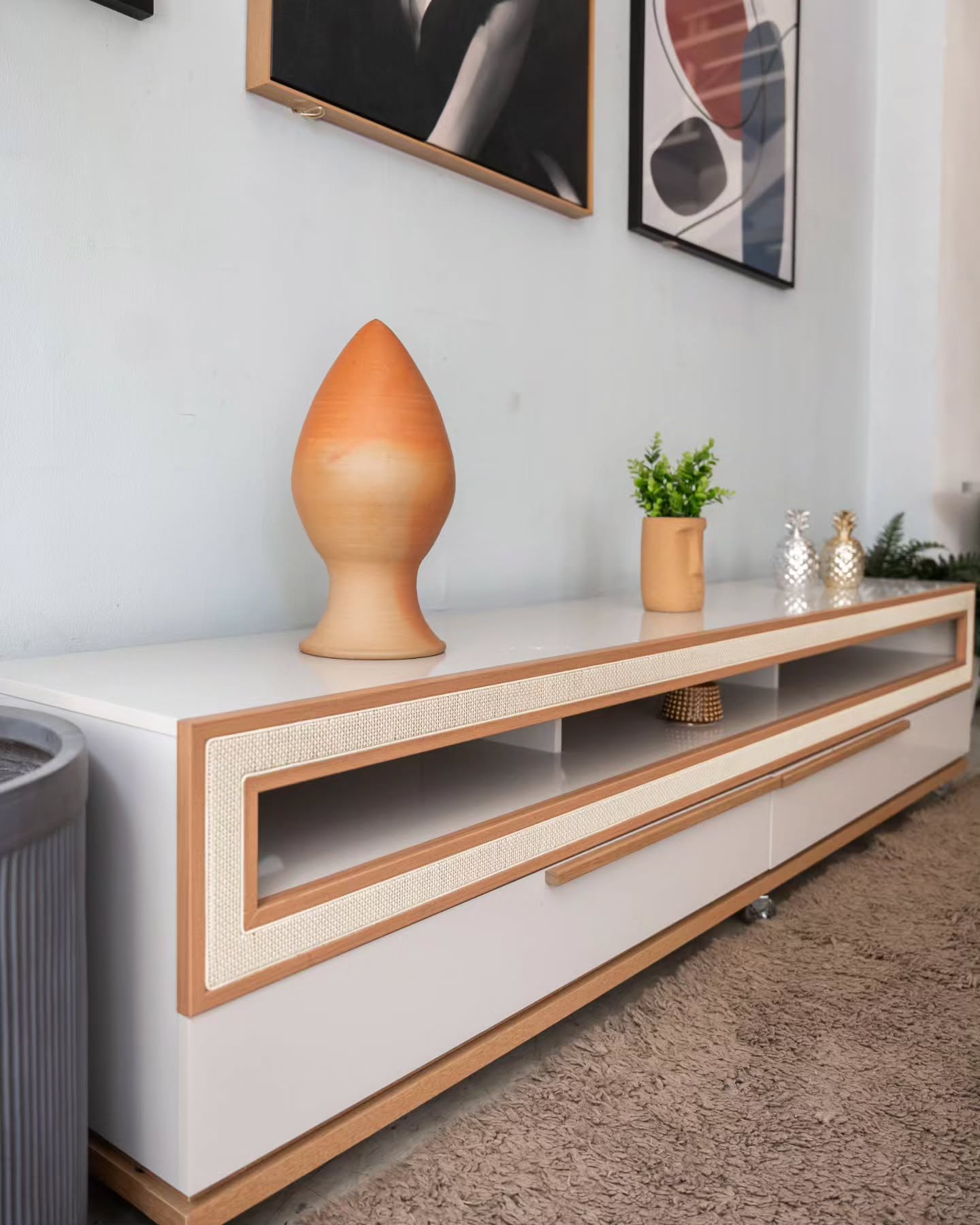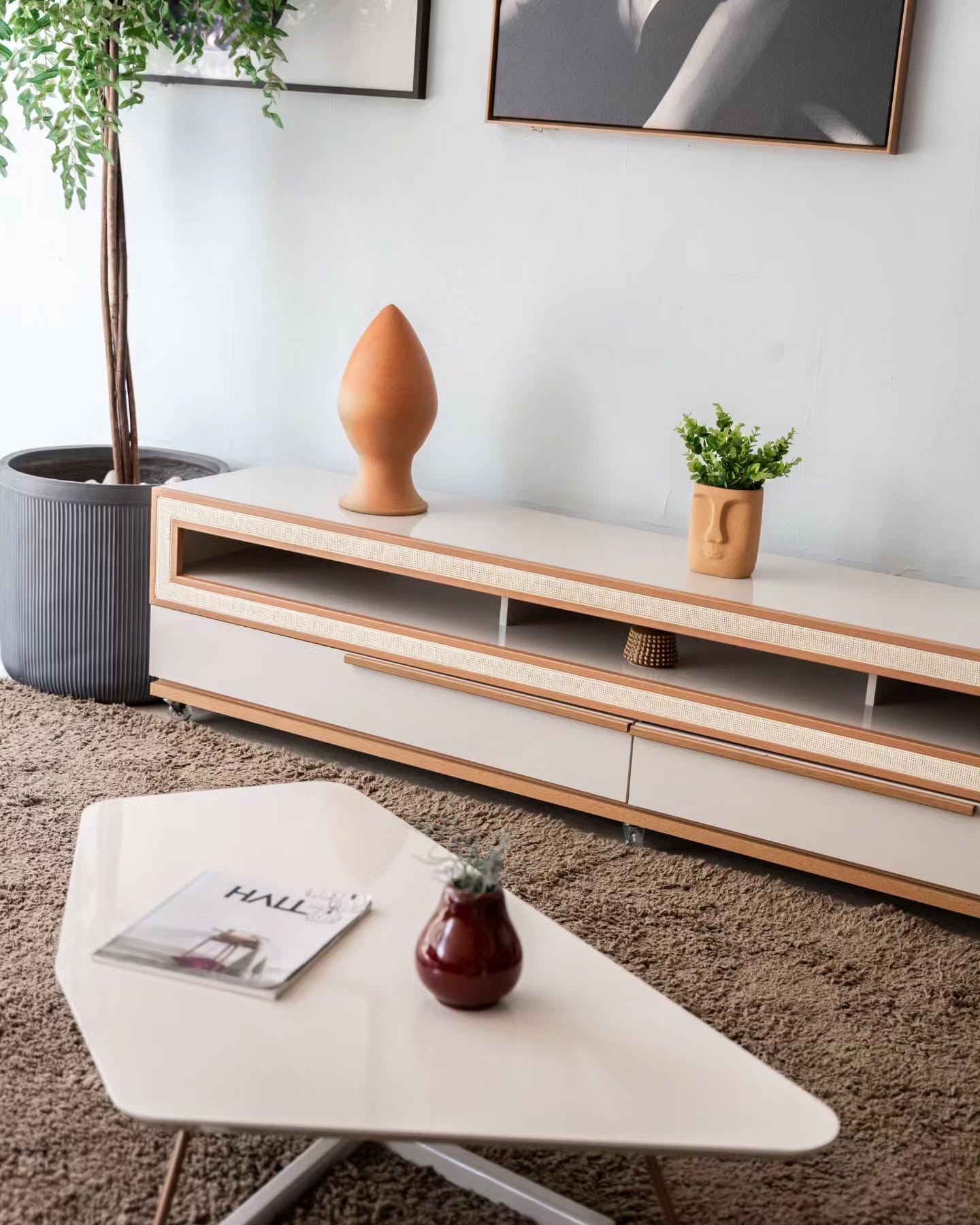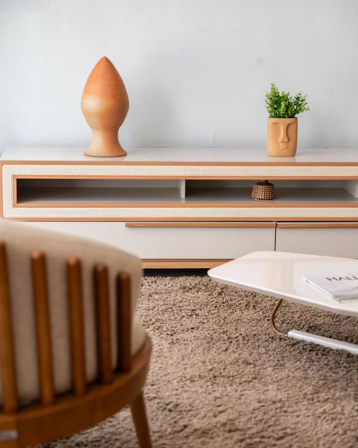 Dê um toque moderno à sua sala com o Rack Thomas de 2,20m em laca off white.